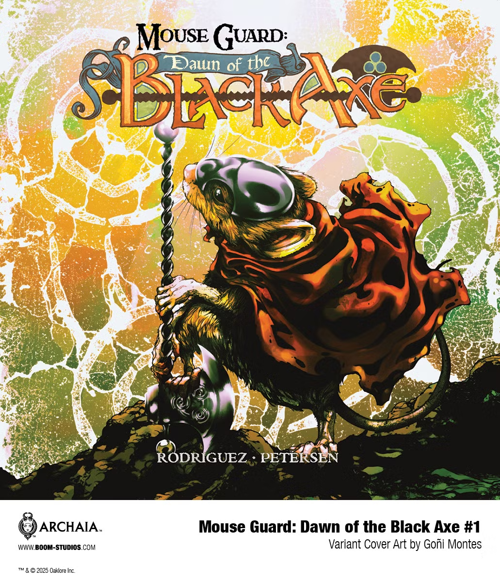 Mouse Guard: Dawn Of Ther Black Axe #1 появится в магазинах комиксов 19 марта. Основную обложку нарисовал Родригес, а варианты — Петерсен, Гони Монтес, Дерек Лауфман.