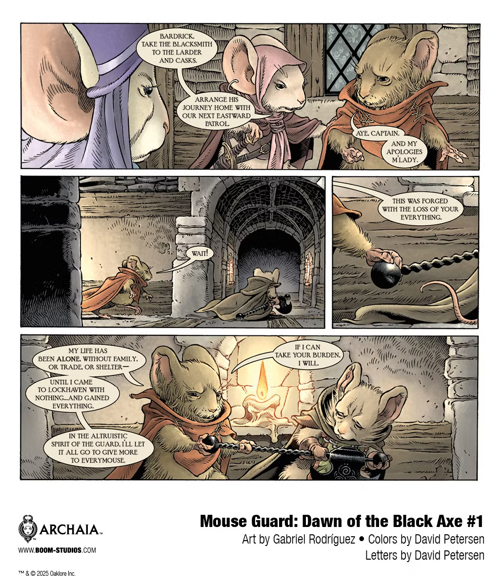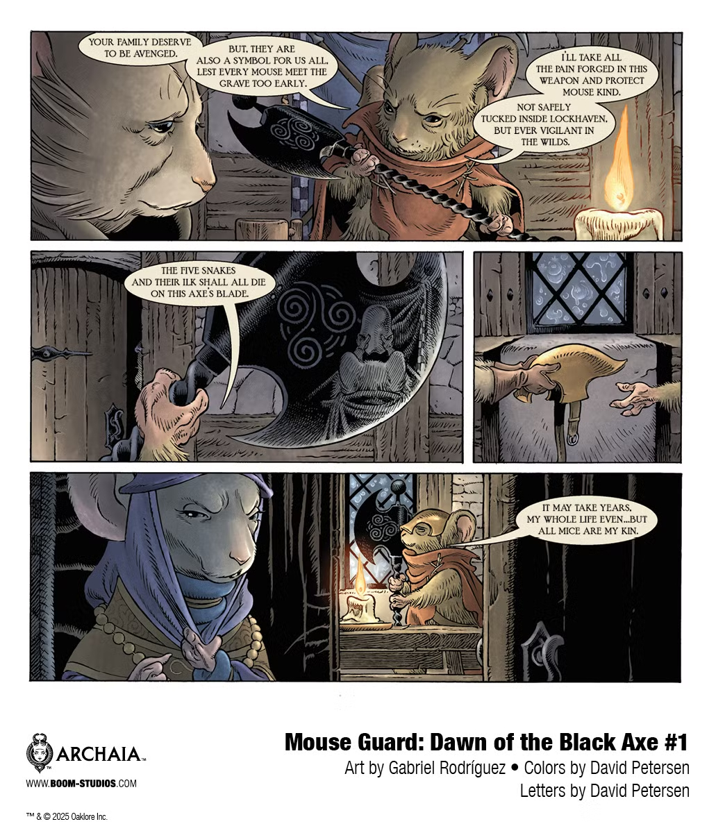 Через месяц BOOM! Studios издаст первый выпуск комикса Mouse Guard: Dawn Of Ther Black Axe. Это, если что, будет приквел к событиям оригинального комикса «Мышиная гвардия». Цикл известный, у нас его даже издавали на русском языке.