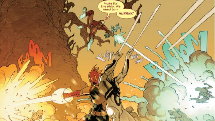 Кэрол Дэнверс махается изо всех сил, но шансы становятся слишком ничтожны даже для неё. Особенно после смачного плевка кислотой по лицу. Казалось бы, все надежды героини потеряны, пока с неба не падают два знакомых типчика, чтобы спасти её. Это Эмма Фрост и Броня. Мутанты расправляются с ксеноморфами, а Росомахе удаётся вытащить Дэнверс. Позже, после обработки ран, она узнает, что Старка и Моралеса просто завалило ксеноморфами. Кэрол и мутанты возвращаются в город, но находят лишь бронированный труп Старка. Такая вот жесть творится.