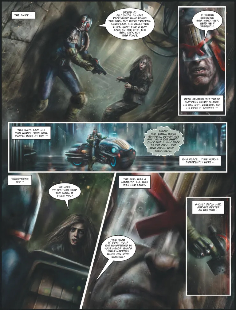 Судья Дредд известен не только фильмами, но и тем, что поддерживает безжалостный закон и порядок на улицах Мега-сити-1 в своих комиксах. Собственно, оттуда он и перекочевал в фильмы с Сильвестром Сталлоне и Карлом Урбаном. Однако время от времени наш знаменитый законник отправляется под эти улицы. А именно — в подземный город, где таятся странные и сверхъестественные явления. Новая история о Дредде, выходящая сейчас в журнале 2000 AD, называется «Cдвигом» (The Shift). Она является последней из цикла от сценариста Кена Ниманда(2000 AD, Megatropolis) и художника Ника Персиваля(Judge Dredd: The Megazine, Clive Barker's Hellraiser), в которых Дредд противостоит угрозам куда более страшным, чем типичный преступник. Но что такое «Сдвиг»? И что скрывается в подполье города, ожидая шанса бросить вызов самому квадратному подбородку Мега-сити?