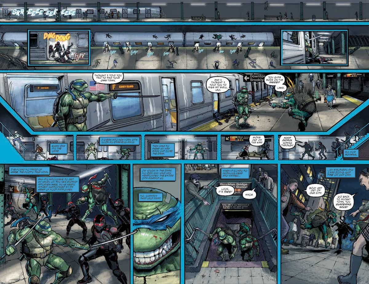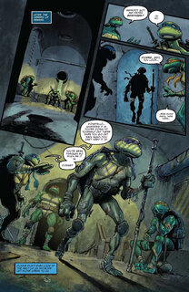На представленных страницах художник Хуан Феррейра (Spine-Tingling Spider-Man) показывает неплохой ниндзя-экшен в метро — Черепашки сражаются с кланом Ноги. Но куда больше впечатляет, как Феррейра показал сломленного Донателло, уже дошедшего до «разговоров» с погибшим Сплинтером.