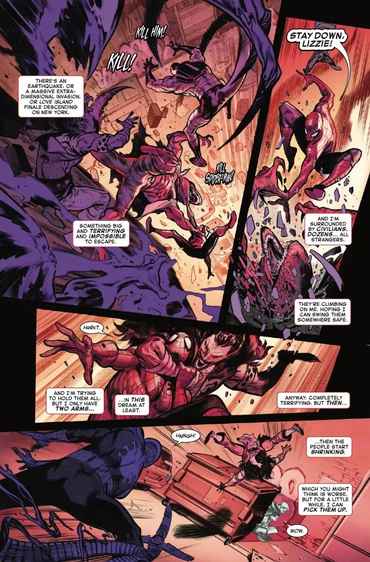 На представленных страницах мы видим, как Паучок сражается со множеством своих врагов. И, если поглядеть на синопсис комикса, нашему красно-синему герою либо снится кошмар, либо у него галлюцинации. Над комиксом работали сценарист Джо Келли (Deadpool, Four Eyes), художник Пепе Ларрас (Blood Hunt).