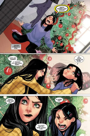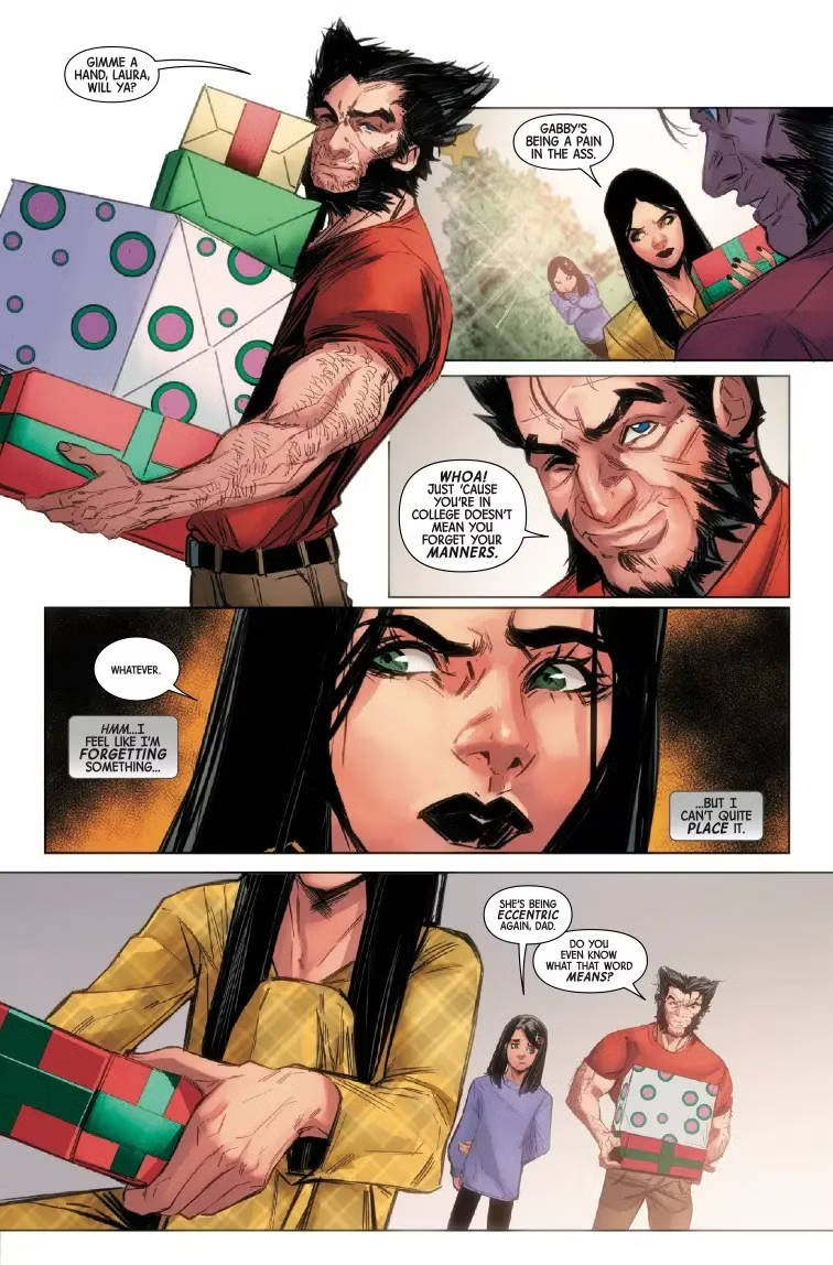 На этой неделе Marvel Comics выпустило уже шестой номер серии Laura Kinney: Wolverine про Лору Кинни — девушку-клона Росомахи. И в нём героиня попала в очень странное место — идеальную версию своей жизни. Праздники, подарки, любящие «папа» Логан и сестра-клон Габби, никаких убийств. Странно? Для такого персонажа, как Лора — да.