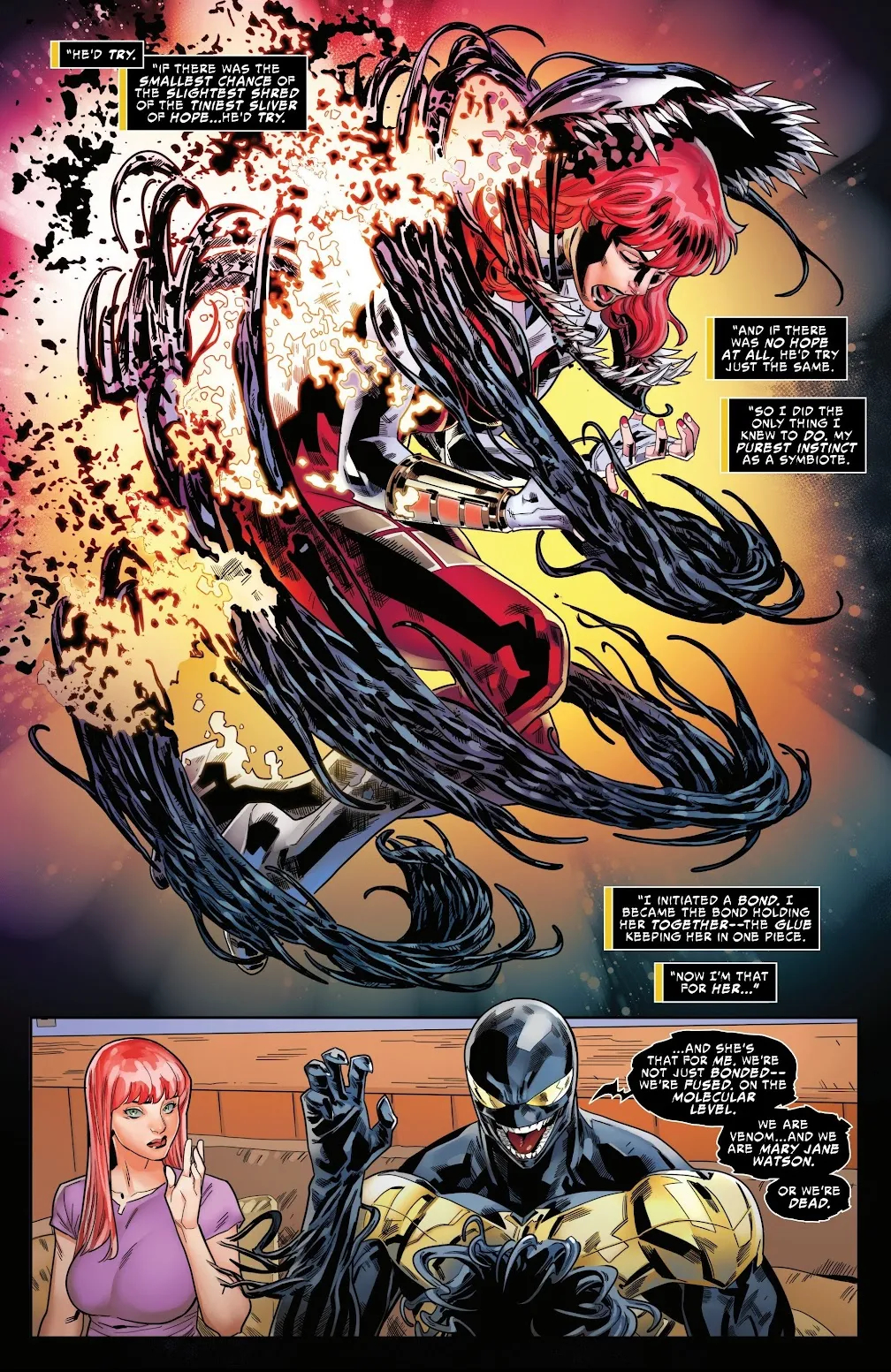 В прошлом месяце мы писали, что Marvel Comics официально представило Мэри Джейн, модель и бывшую девушку Человека-паука, в роли нового Венома. И на днях (7 мая) вышел комикс All New Venom #6, где читателям показали и объяснили, как рыжая красотка и чёрный симбиот стали парой. За сценарий отвечал Эл Юинг (The Immortal Hulk), а рисовал — художник Карлос Гомес (Fantastic Four, Red Sonja).