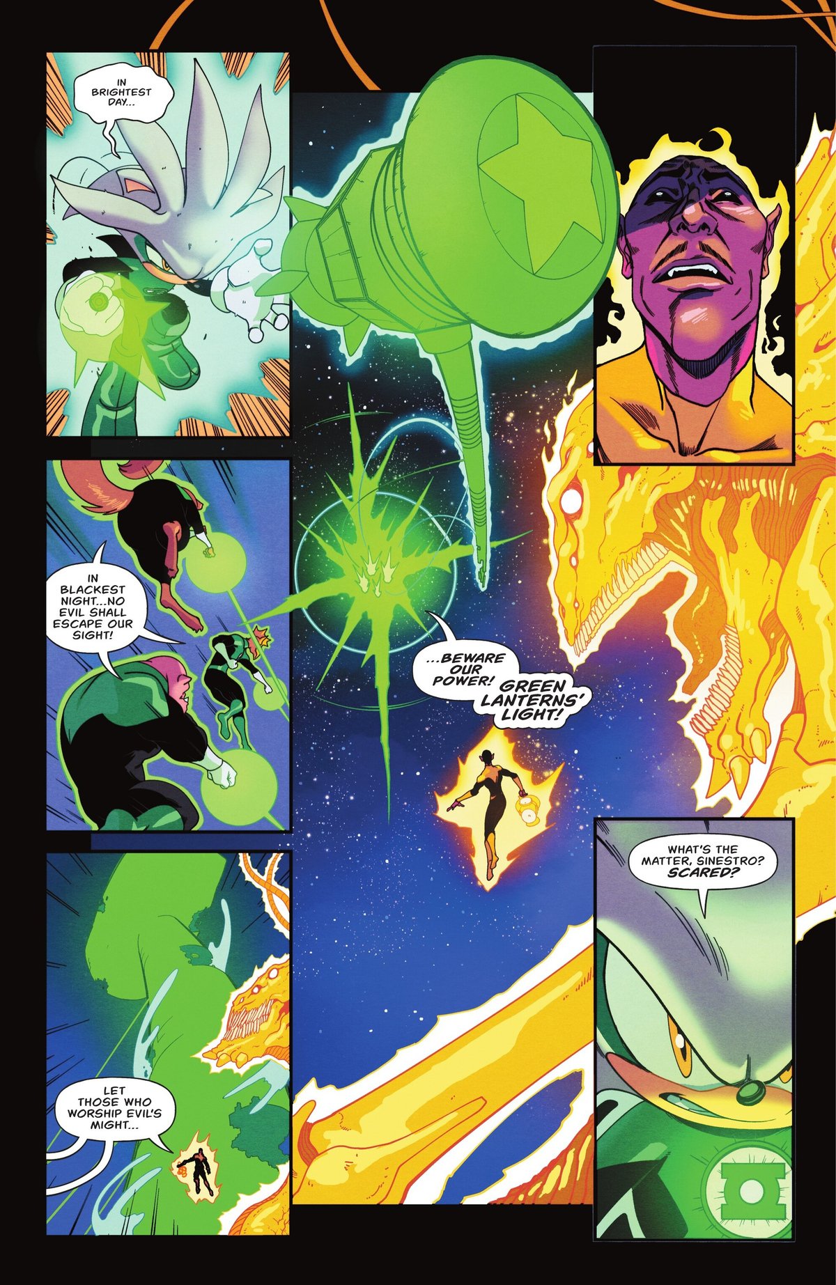 Сильвер становится Зелёным Фонарём. И создаёт гигантскую изумрудную ракету против Синестро после произнесения знаменитой клятвы. Шэдоу, конечно же, перевоплощается в Бэтмена. Эми примеряет доспехи Чудо-женщины, Наклз становится Суперменом, Соник носится как Флэш, а Тейлс преображается в Киборга.