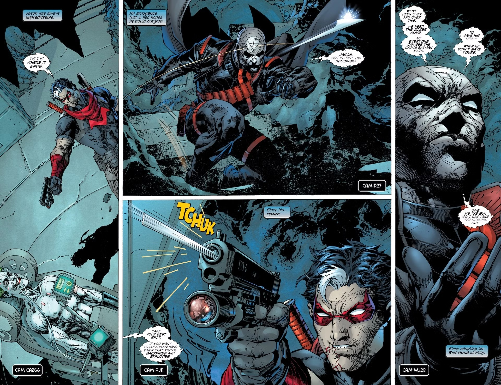 В Batman #160 Бэтмен столкнётся с новым злодеем по кличке Тишина, о котором мы писали, да и показывали его внешний вид. Лоэб и Ли также обещают довести Бэтмена до предела в этом номере. Ну а на представленных страницах мы видим, как Хаш и Красный Колпак Джейсон Тодд напряжённо разговаривают… в Бэтпещере. При этом Хаш не даёт бывшему Робину убить Джокера.