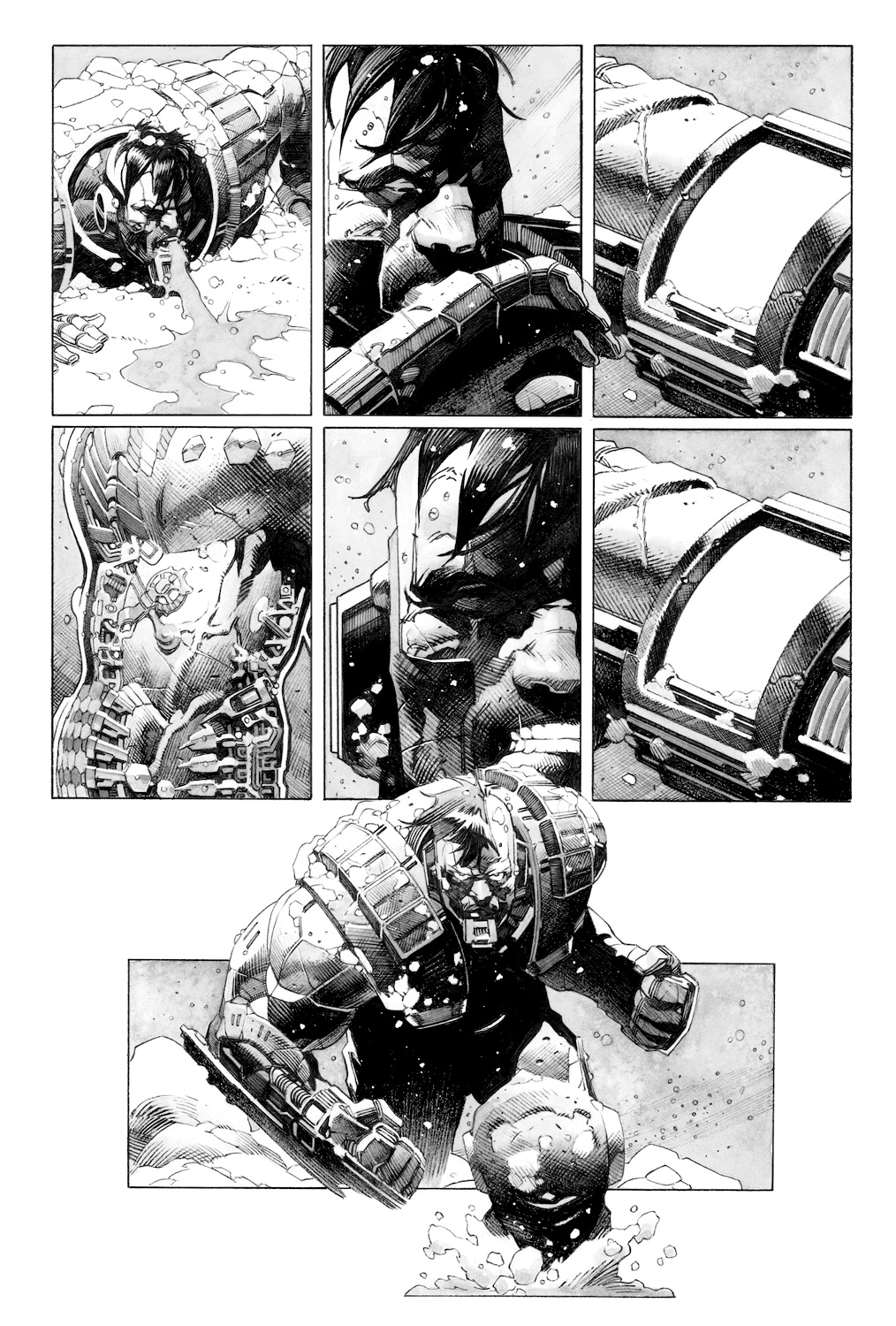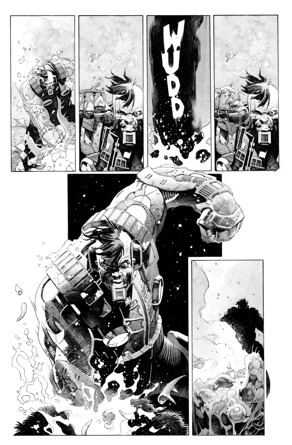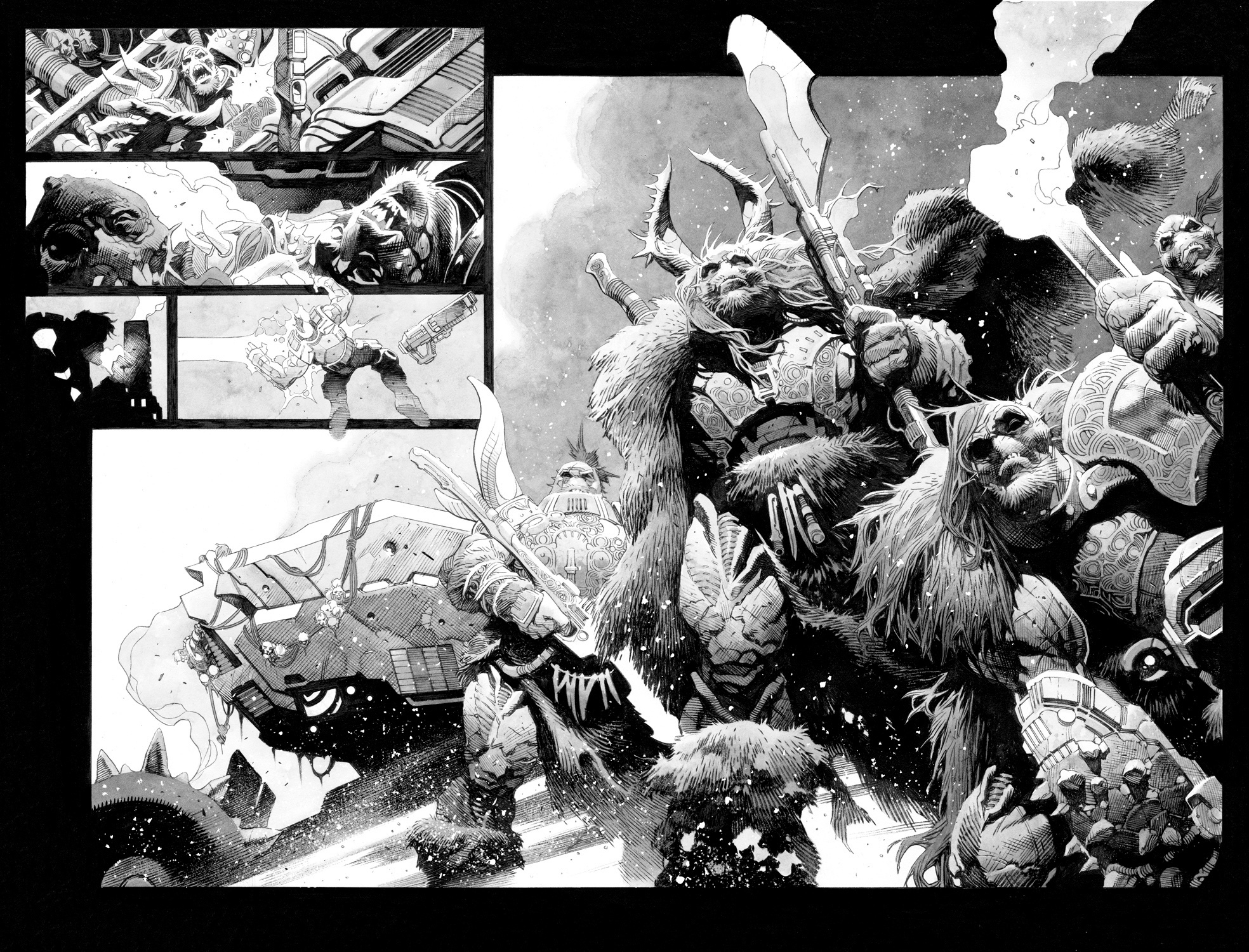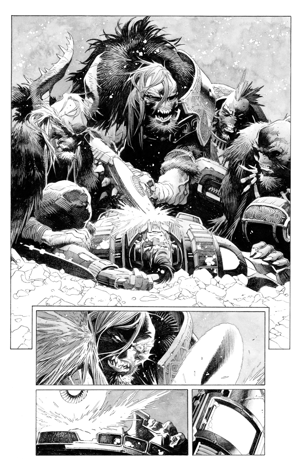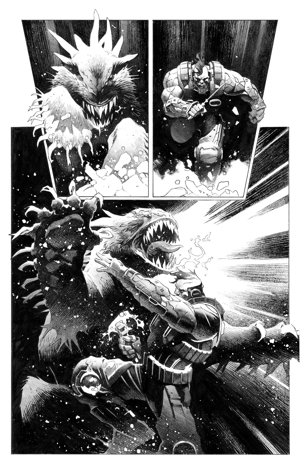Пока что в чёрно-белом цвете, но насладиться рисунком это не мешает. Принадлежит он руке Томаса Джорелло (Star Wars, Conan), основного художника серии. Недостатка в экшене, кажется, не будет.