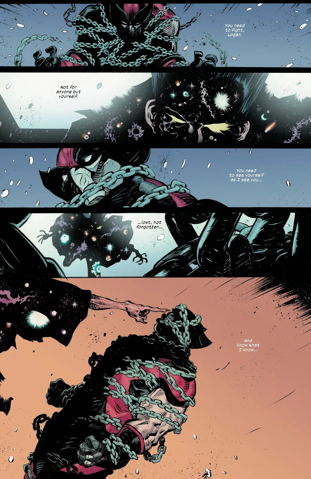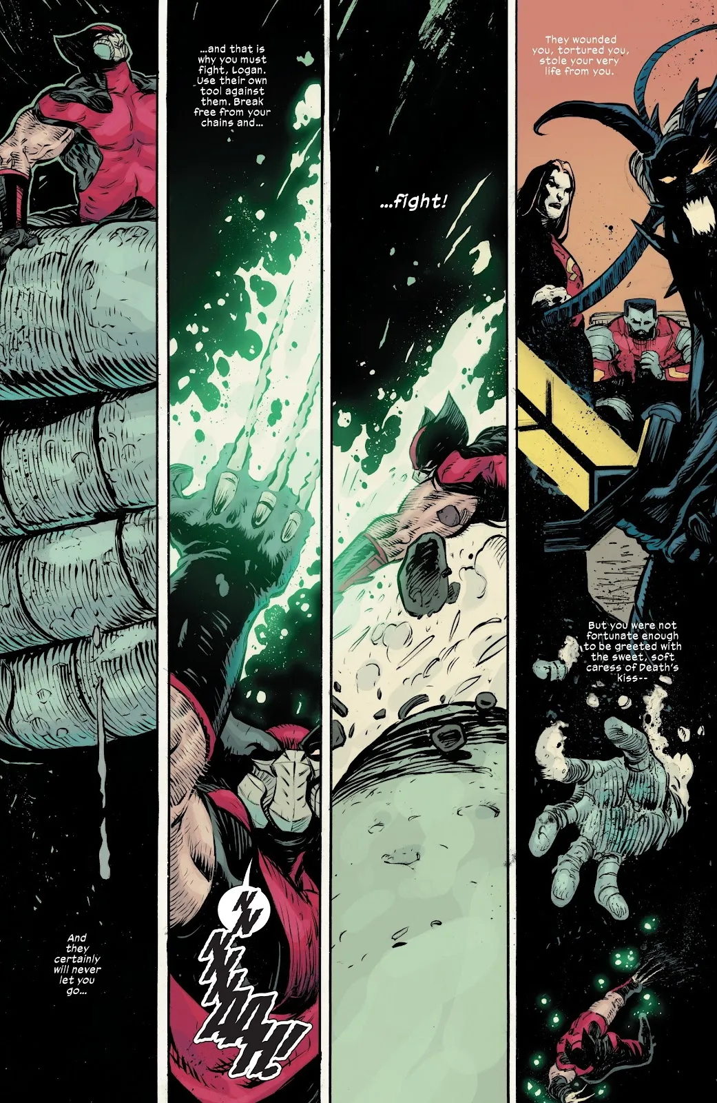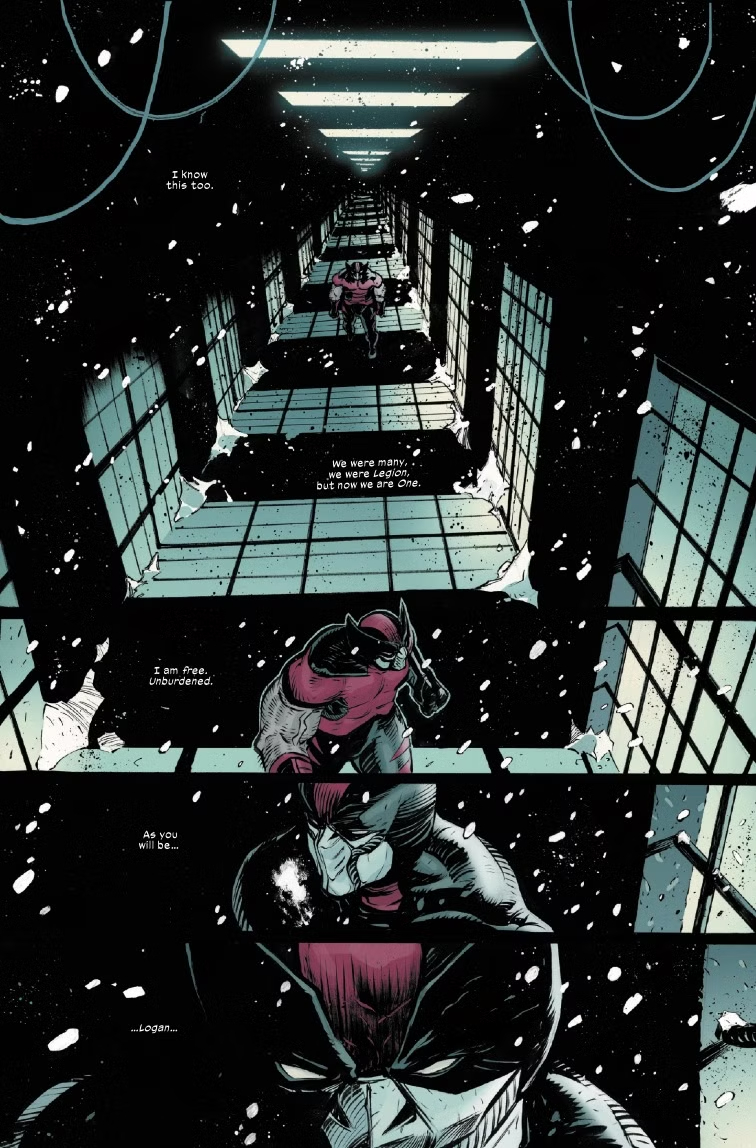 Логан, благодаря помощи Легиона, встречает образы своих пленителей — Коллоса, Магику и Красного Омегу — и сражается с ними. Одновременно с этим Дэвид даёт экспозицию о прошлом Росомахи. Например, именно Создатель (злая версия Рида Ричардса из Фантастической четвёрки) и трио выше привили нашему когтистому герою адамантий.