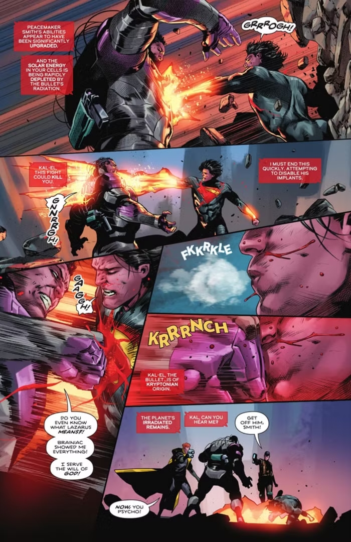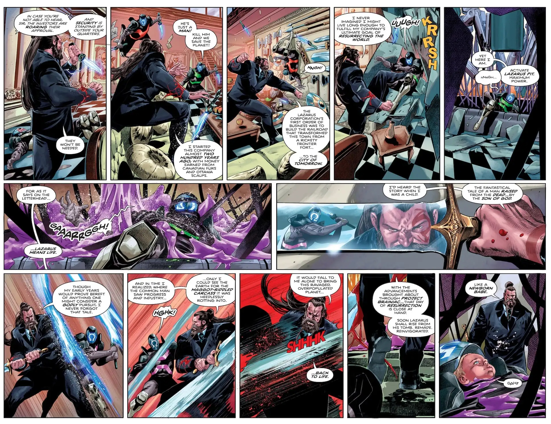 По ходу серии читатели знакомятся с новыми версиями классических персонажей: от агента «Лазаря»… Лоис Лейн до загадочного члена Омега-людей и борца за свободу Джимми Олсена. Внезапно, здесь Лекс Лютор не заклятый враг Супера. Его место пока что занял… Ра'с аль Гул. Который не только противостоит герою, но и контролирует огромные территории планеты благодаря армии солдат и практически безграничным лазаревским ресурсам. Ну и понятно, почему корпорацию назвали именно так.