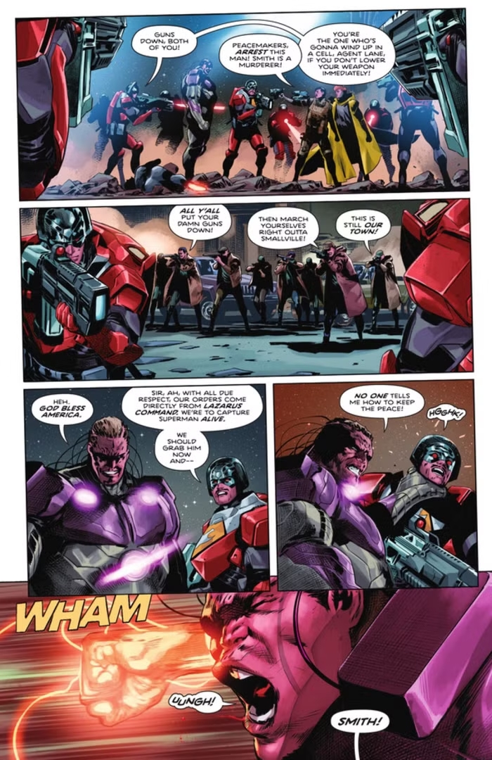 Супермен, Лоис Лейн и Джимми Олсен оказываются в эпицентре жестокой схватки с армией Миротворцев.