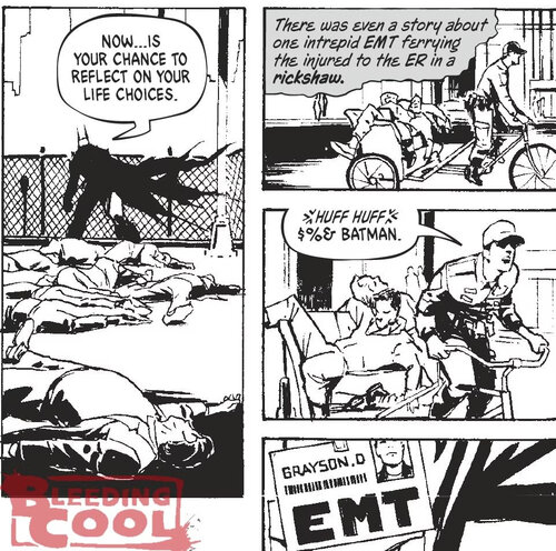В этом выпуске впервые появляется Дик Грейсон, известныйнам также в качестве первого Робина и супергероя Найтвинга в оригинальном комиксном каноне. Тут он… медработник, которому приходится возить раненых членов банды в больницу на коляске, все машины скорой помощи в Готэме уже израсходовали. И какие у него первые слова тут? На*** Бэтмена. Отсылка к сериалу «Титаны», где он говорил то же самое?