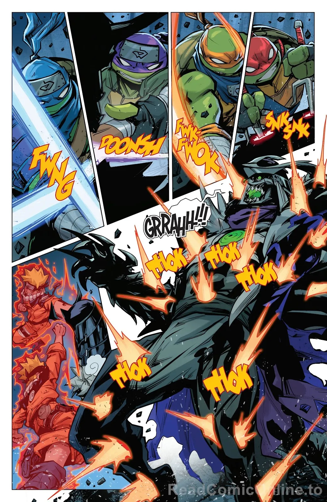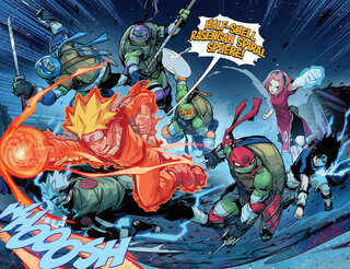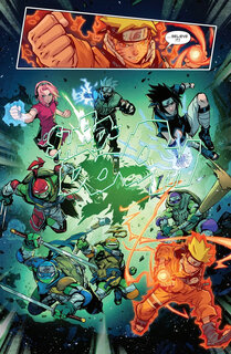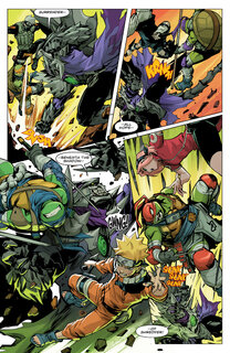 Большая часть всего выпуска отдана на ниндзя-экшен, в котором герои вовсю используют свои навыки, как команда Черепах, так и Наруто со своими товарищами. Поэтому Сакура применяет сверхсилу, а Какаши и Саске — Шаринган в связке с приёмом Чидори. И, конечно, Наруто не боится задействовать технику теневого клонирования и мощь Девятихвостого лиса ради создания особого Рассенгана, нанося мощный удар, а потом Донни, Лео, Майки и Раф закрепляют результат.