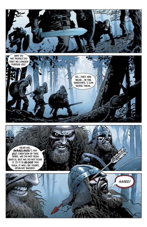 На это аж подрядили, обладателя премии Айснера, Джо Груэтта (Voices In My Head, Cable, Domino), а рисует это легендарный Марсело Фрусин (Hellblazer, Loveless, Kick-Ass: The New Girl). Багряная мини-серия из пяти выпусков называется довольно характерно — Viking Moon («Луна Викингов»).