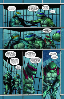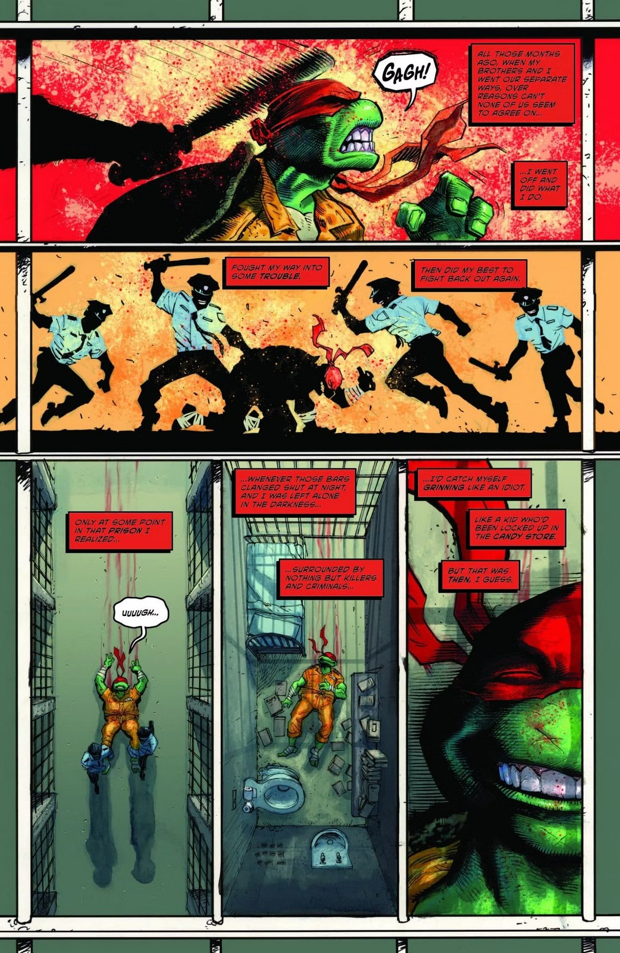 Рисунком занимался Хуан Феррейра (Spine-Tingling Spider-Man). Как видите, на страницах он даёт тюремный экшен с Рафаэлем… на котором он огребает от охраны. Что ж, дубинка она такая — попадёт по голове и всё, тебя вырубили. Будь ты даже мутантом-черепахой.