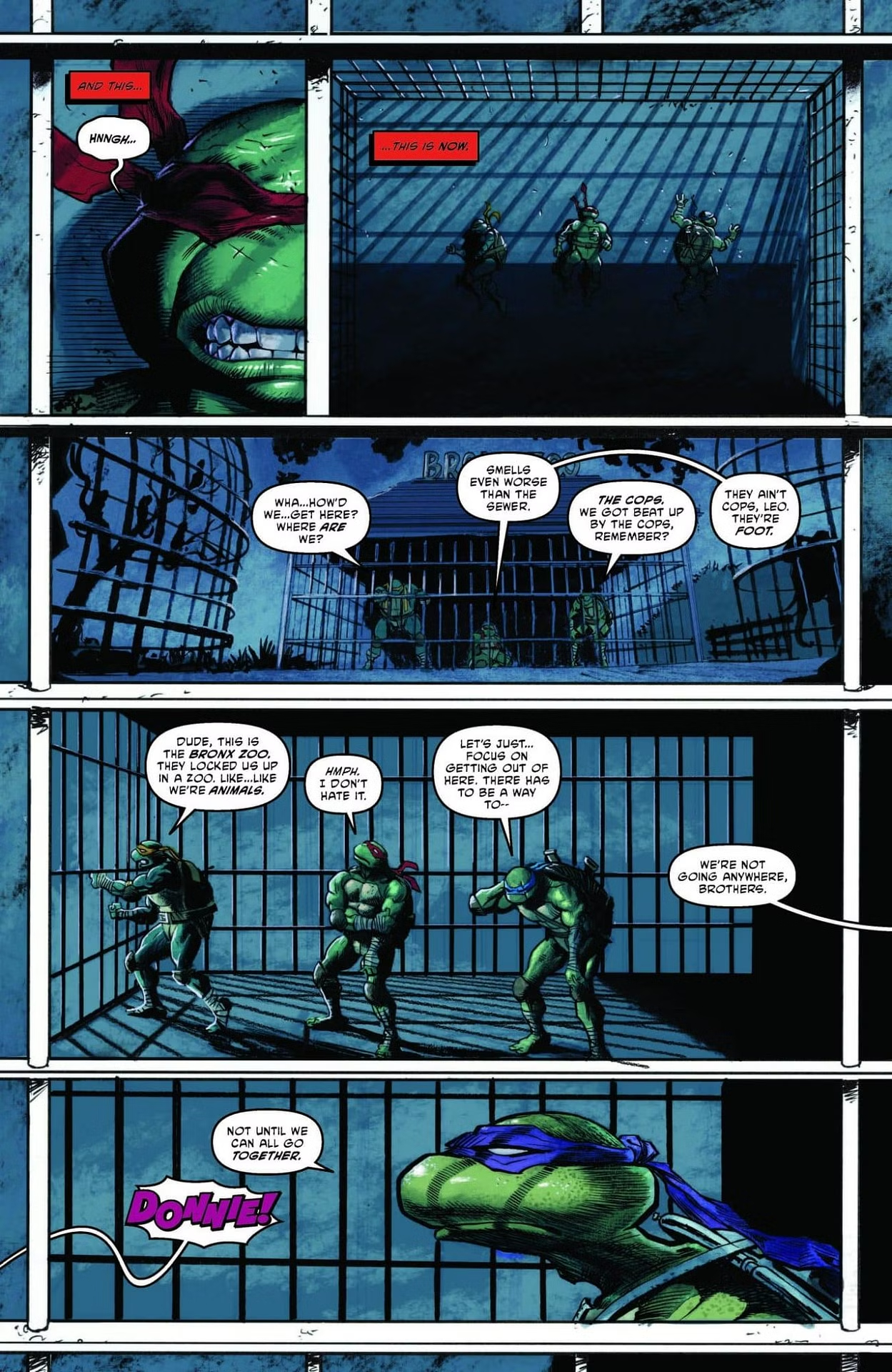 И это всё было… сном. Все четверо братьев сидят в клетке. Зато у Донни наконец-то стало получше с головой, но Раф всё равно остаётся в пессимистичном настроении. Потому что и зачем они все проливали кровь, сбивали костяшки на своих лапах, если Нога всё равно правит Нью-Йорком.