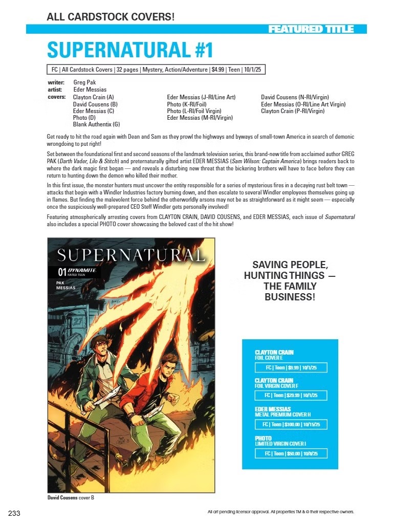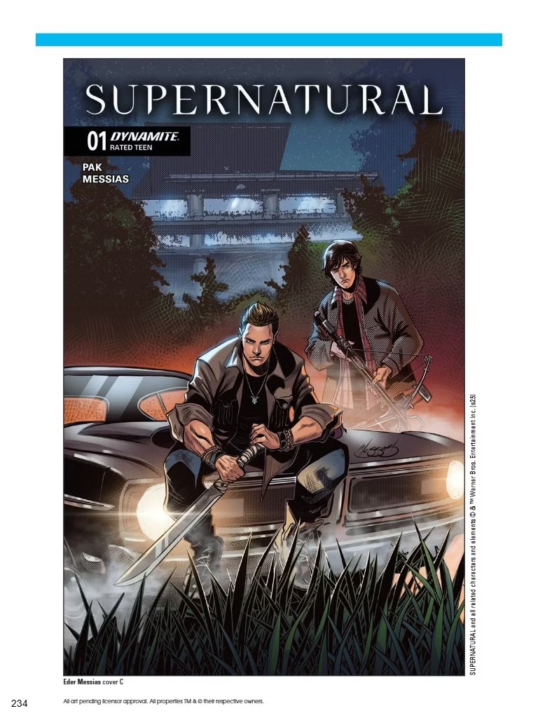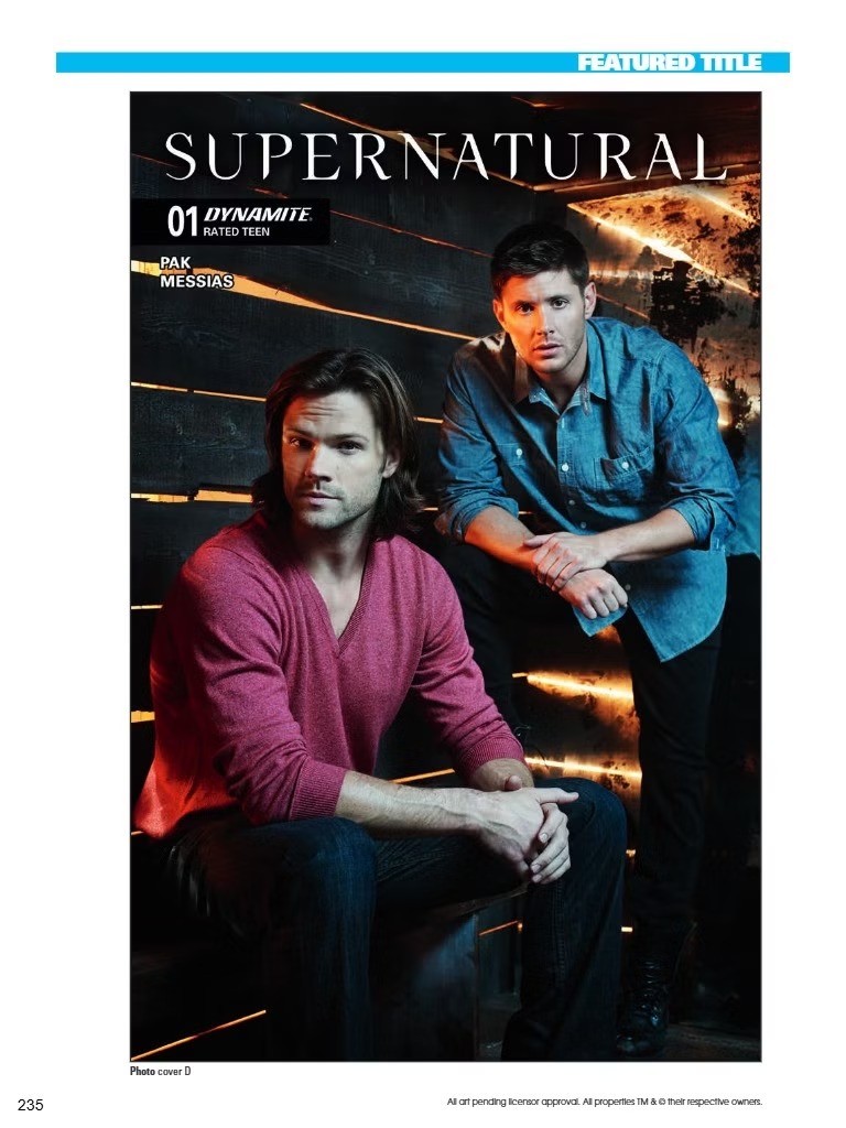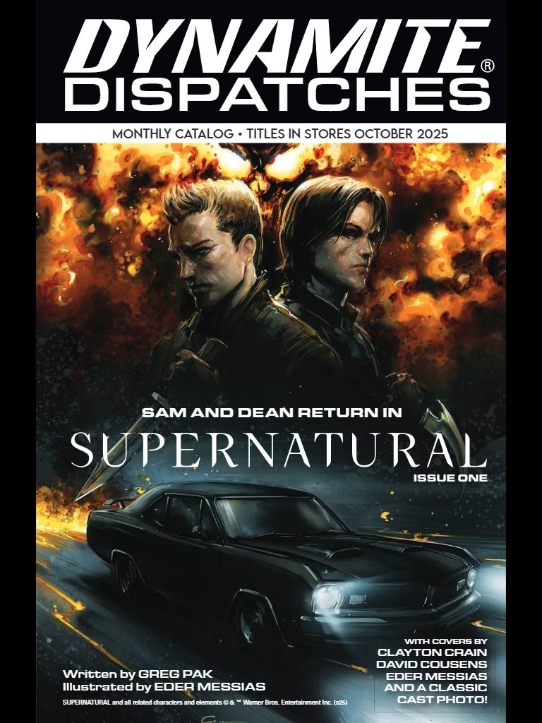 Комикс войдёт в новый каталог издательства Dynamite Dispatches. Атмосферные вариантные обложки от Клейтона Крейна, Дэвида Казенса и Эдера Мессиаса в каждом выпуске «Сверхъестественного» будут дополнены ещё одной оригинальной фотообложкой с Дженсеном Эклзом и Джаредом Падалеки прямиком из телесериала.