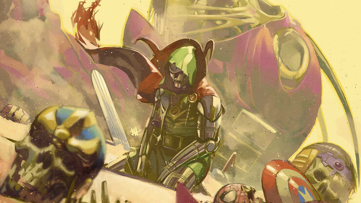 Бен Харви (West Coast Avengers, Legion of X) создал обложку, которая сильно так намекает на падение могущественного дока. Интрига нарастает: сможет ли Дум сохранить титул Верховного Чародея или его место займёт кто-то другой? Художник Девмалья Прамоник (Dune: House Atreides, Vampire: The Masquerade: Winter's Teeth) нарисовал специальное промо-изображение, где изобразил всех кандидатов на теоретически вакантное место. Такая вот интрига.