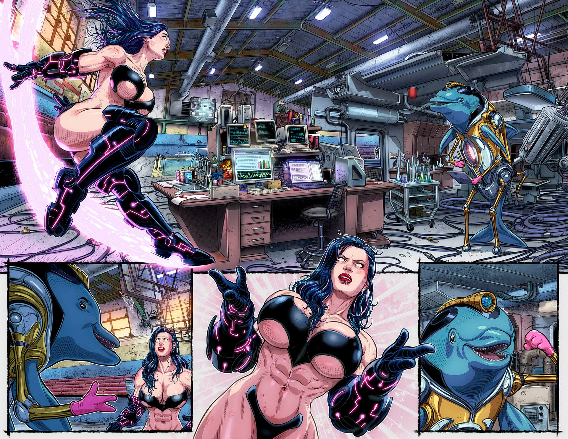 В центре сюжета — весьма необычный дуэт из грудастой киборга-супергероини и её верного напарника… говорящего дельфина по имени Том. Казалось бы, что может пойти не так? Но когда Том решает испытать своё новейшее «эко-изобретение», высокотехнологичный унитаз забрасывает его в другое измерение. Похоже, что индустрия комиксов наконец-то достигла того дна, от которого можно оттолкнуться. Теперь «Сладкой бомбочке» (то есть, нашей героине) предстоит нырнуть в буквальном смысле в самое пекло, чтобы спасти своего эксцентричного друга.