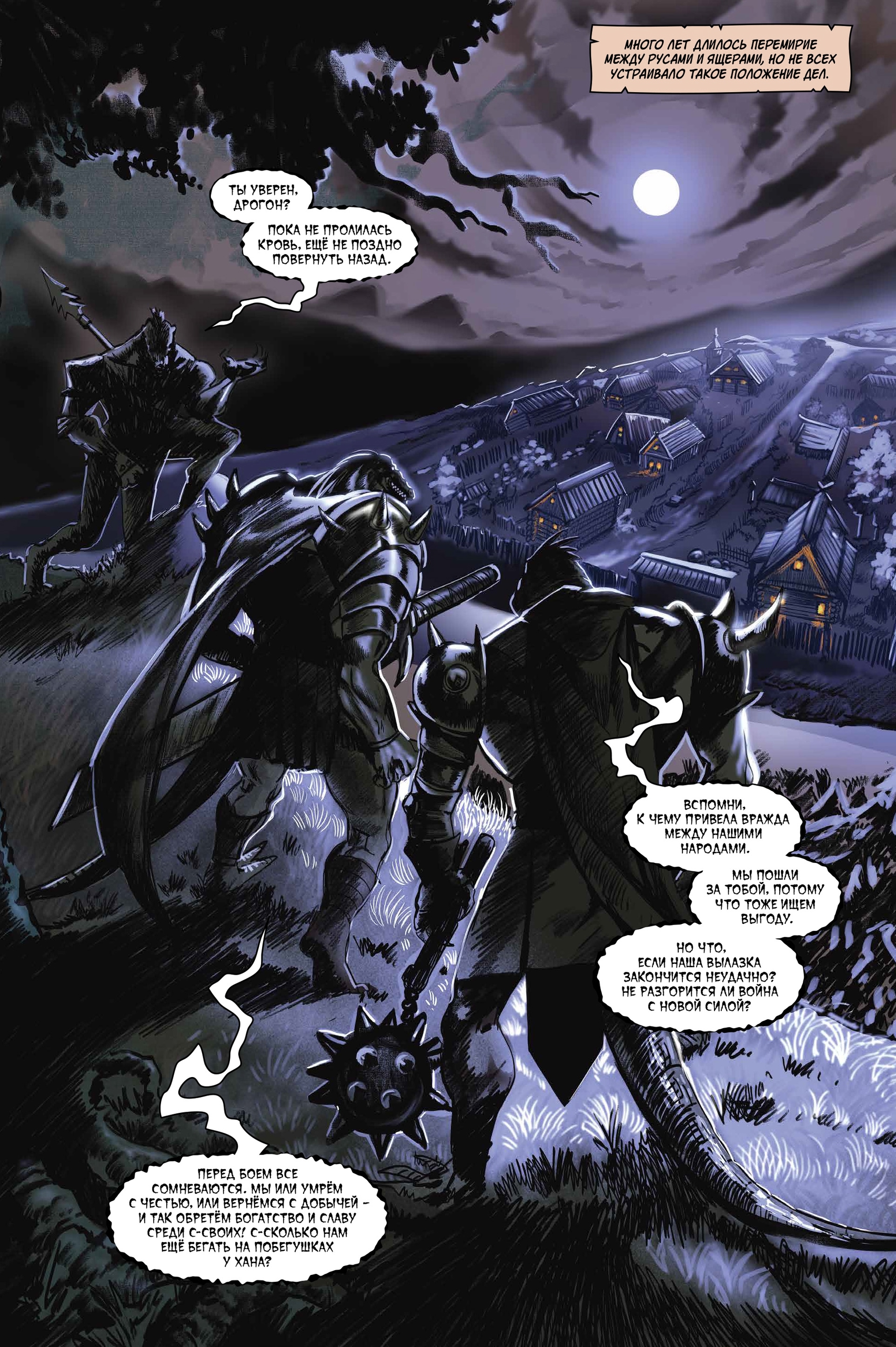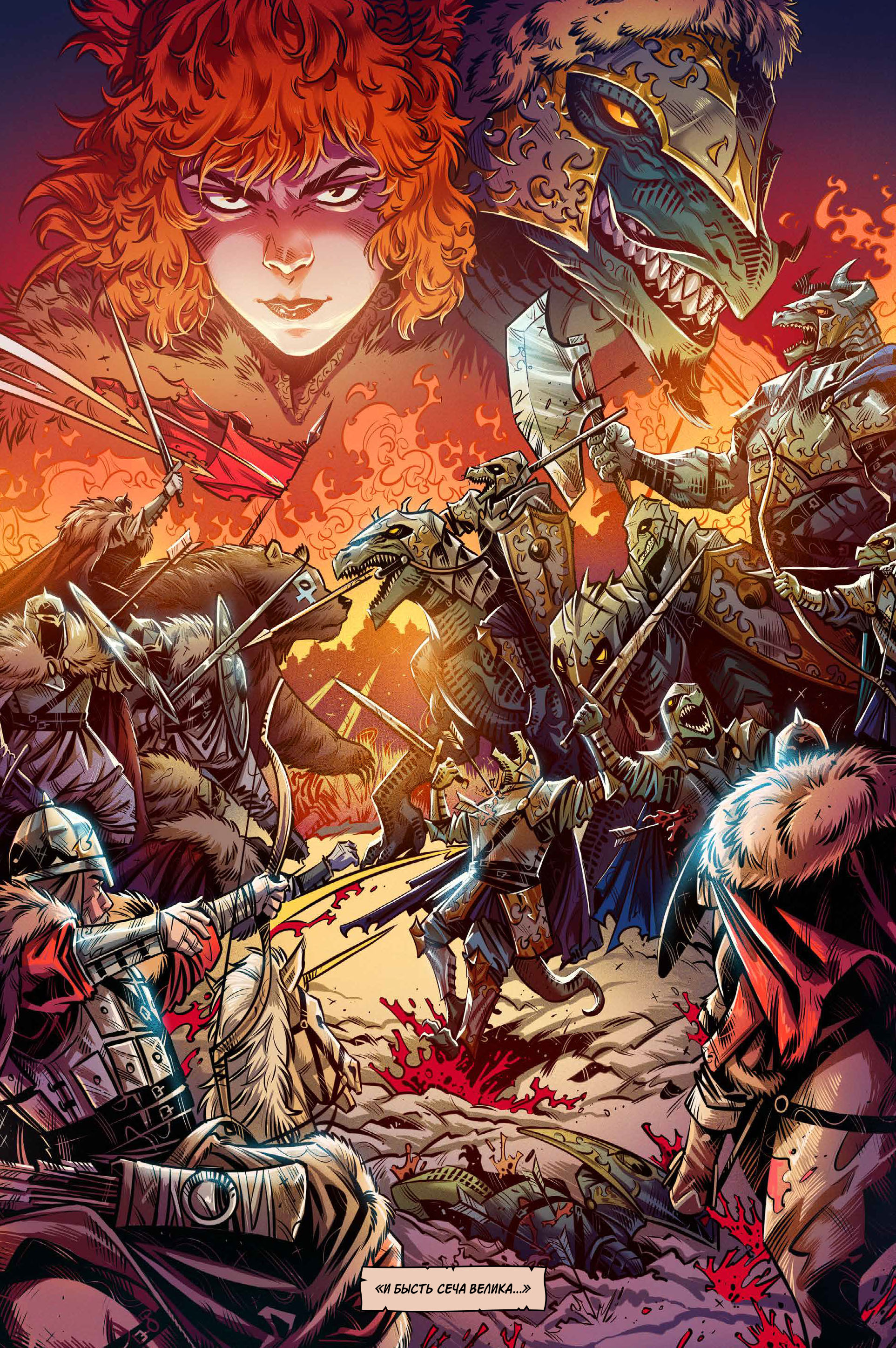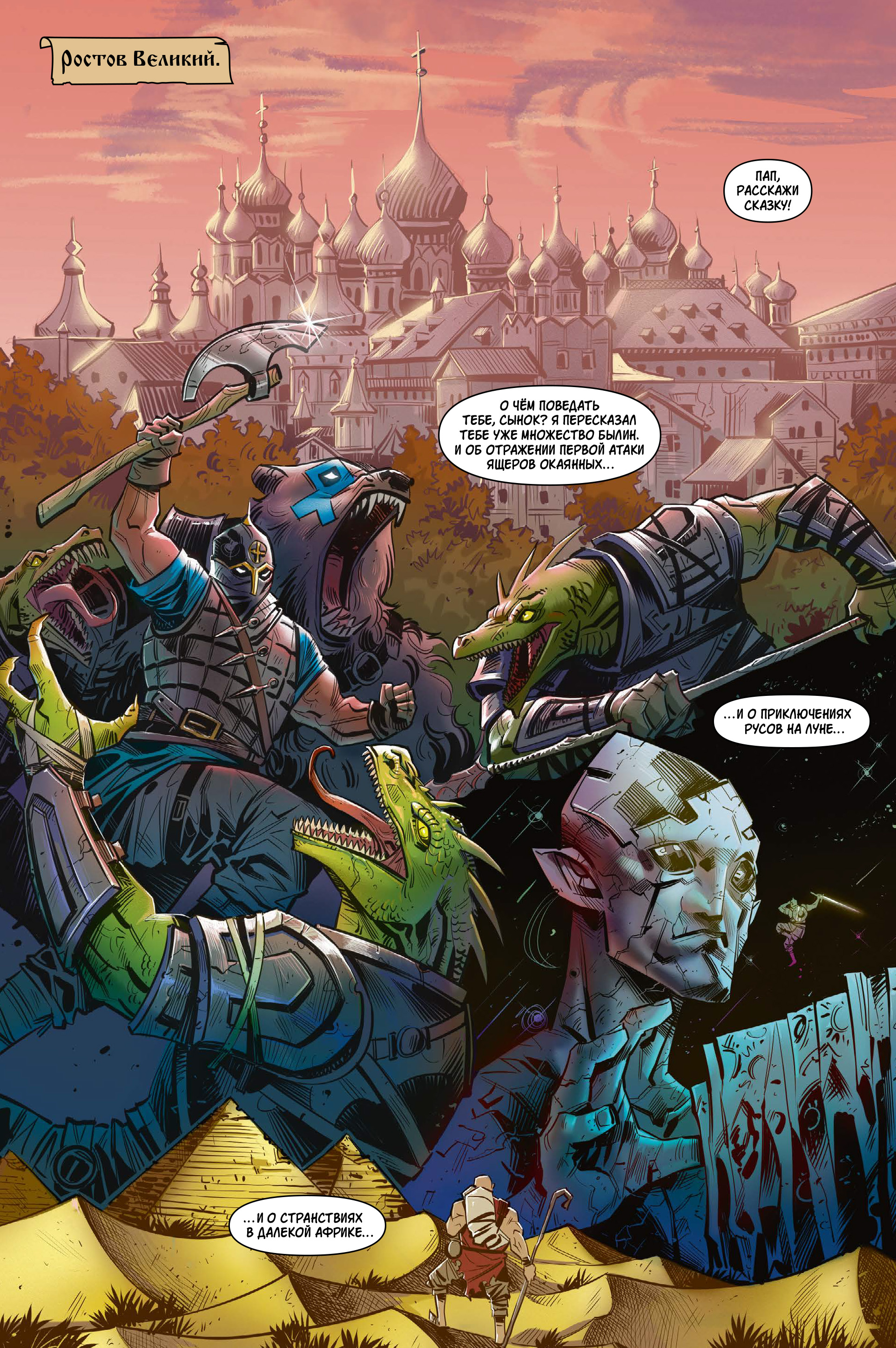 Первые три выпуска рассказывали о похождениях Дрочеслава, Всеслава и Радислава и были скорее юмористическими сборниками эпизодов с условной сквозной линией, но вот дальше... Полноценная сюжетная арка из трёх выпусков, повествующая о кровопролитной войне между русами, во главе с храброй Ольгой, и ящерами, под покровительством хитрого Курт-Хана. Масштабные битвы, запоминающиеся герои, неожиданные повороты — всё это уже ждёт вас внутри!