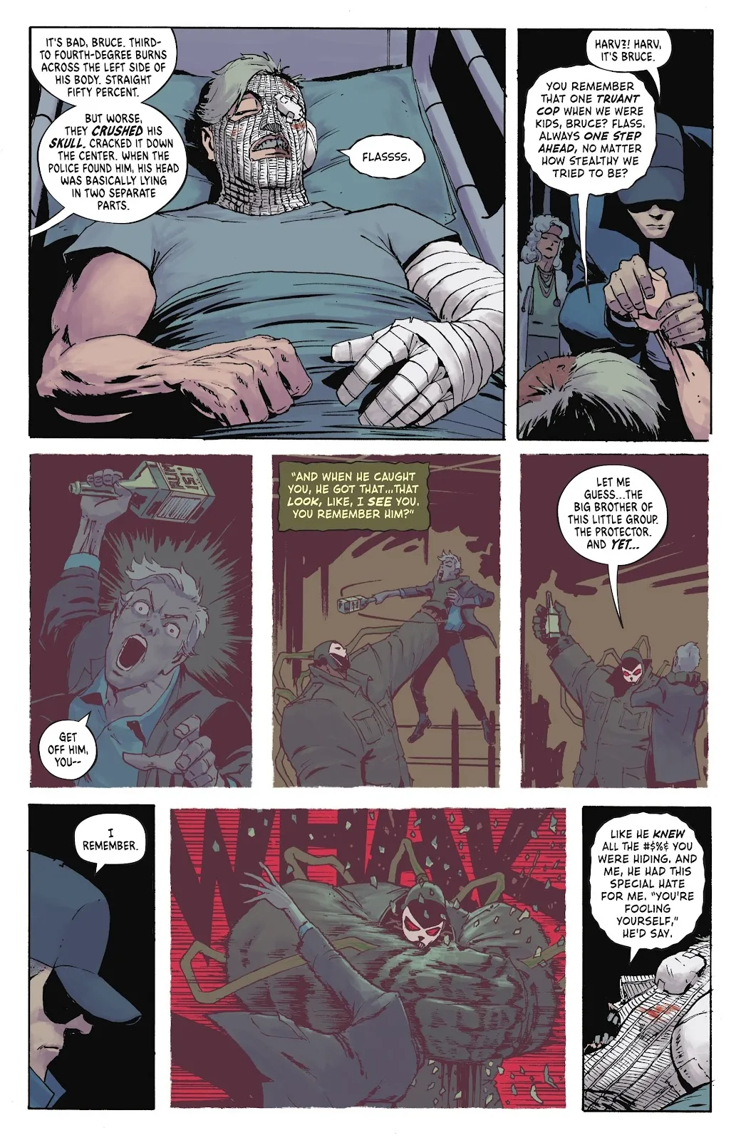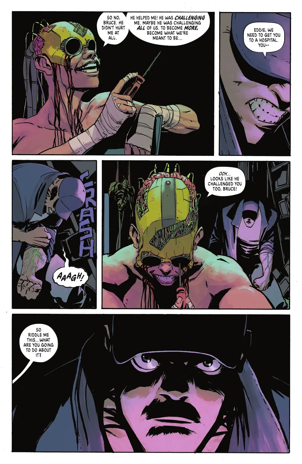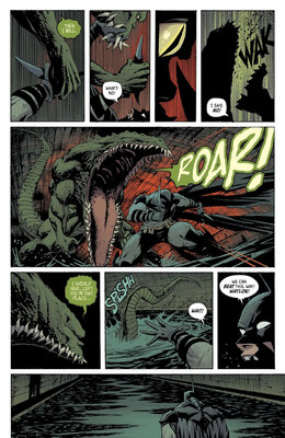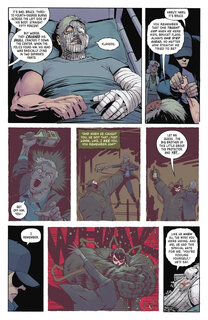 На представленных страницах Бэтмен пытается урезонить мутировавшего Уэйлона Джонса, более известного нам всем в качестве Убийцы Крока. Джонс пытается сдерживаться и просит своего друга убить его, но Тёмный рыцарь отказывается. Под карающую длань Бейна попали и остальные друзья Брюса Уэйна. Это Харви Дент, Освальд Кобблпот и Эдвард Нигма. Это Двуликий, Пингвин и Загадочник. Наверняка после пережитого они будут обвинять Бэтмена в своих бедах, а там уже и в злодейство перейдут. Кстати, наш ушастый протагонист сам страдает от присутствия Яда в своём организме.