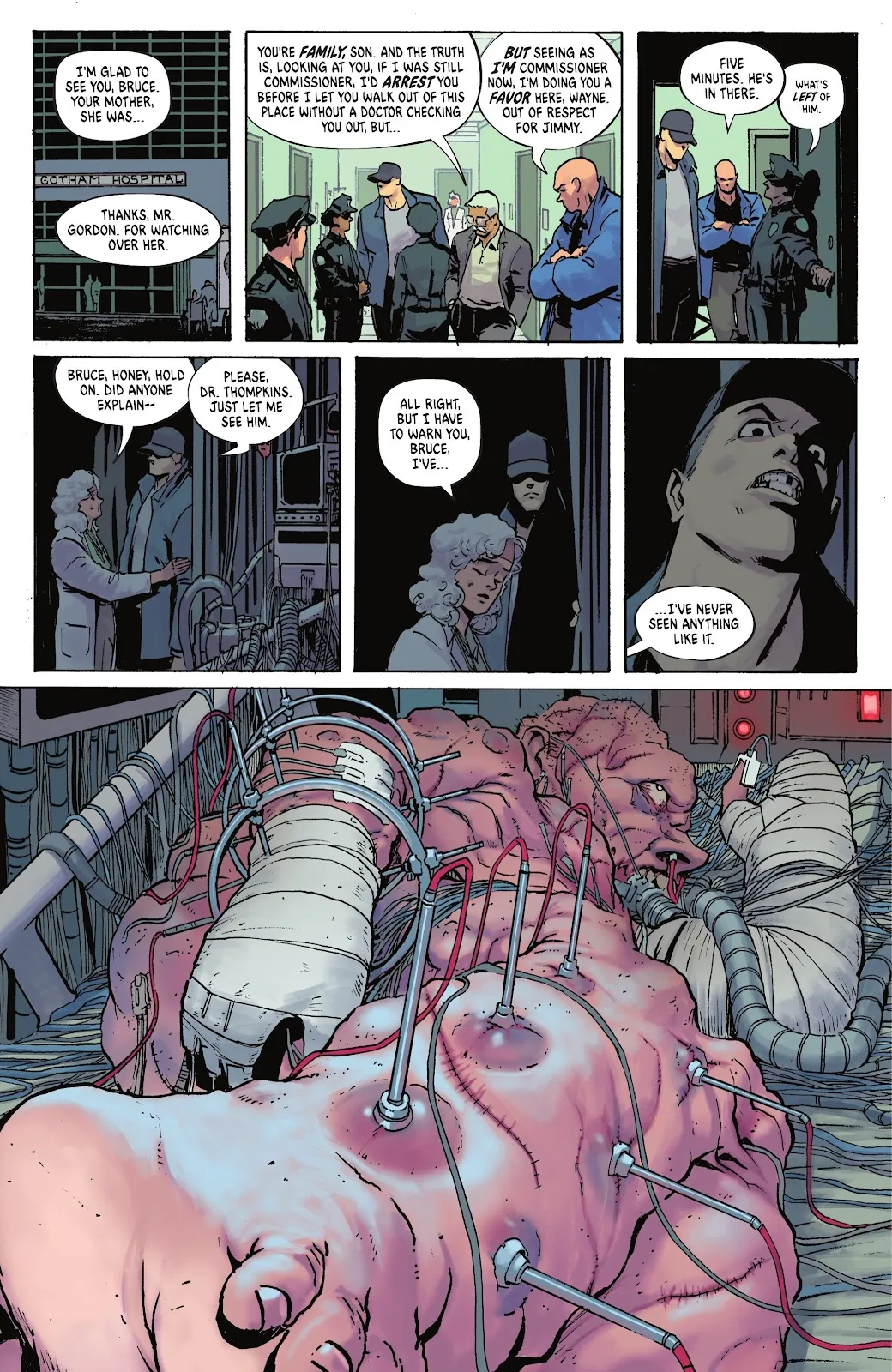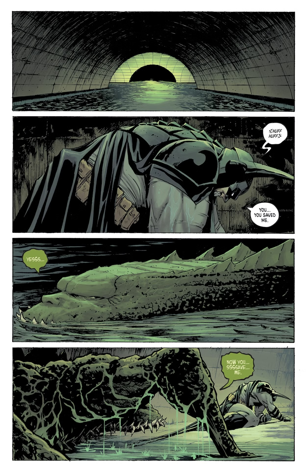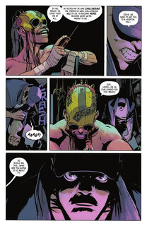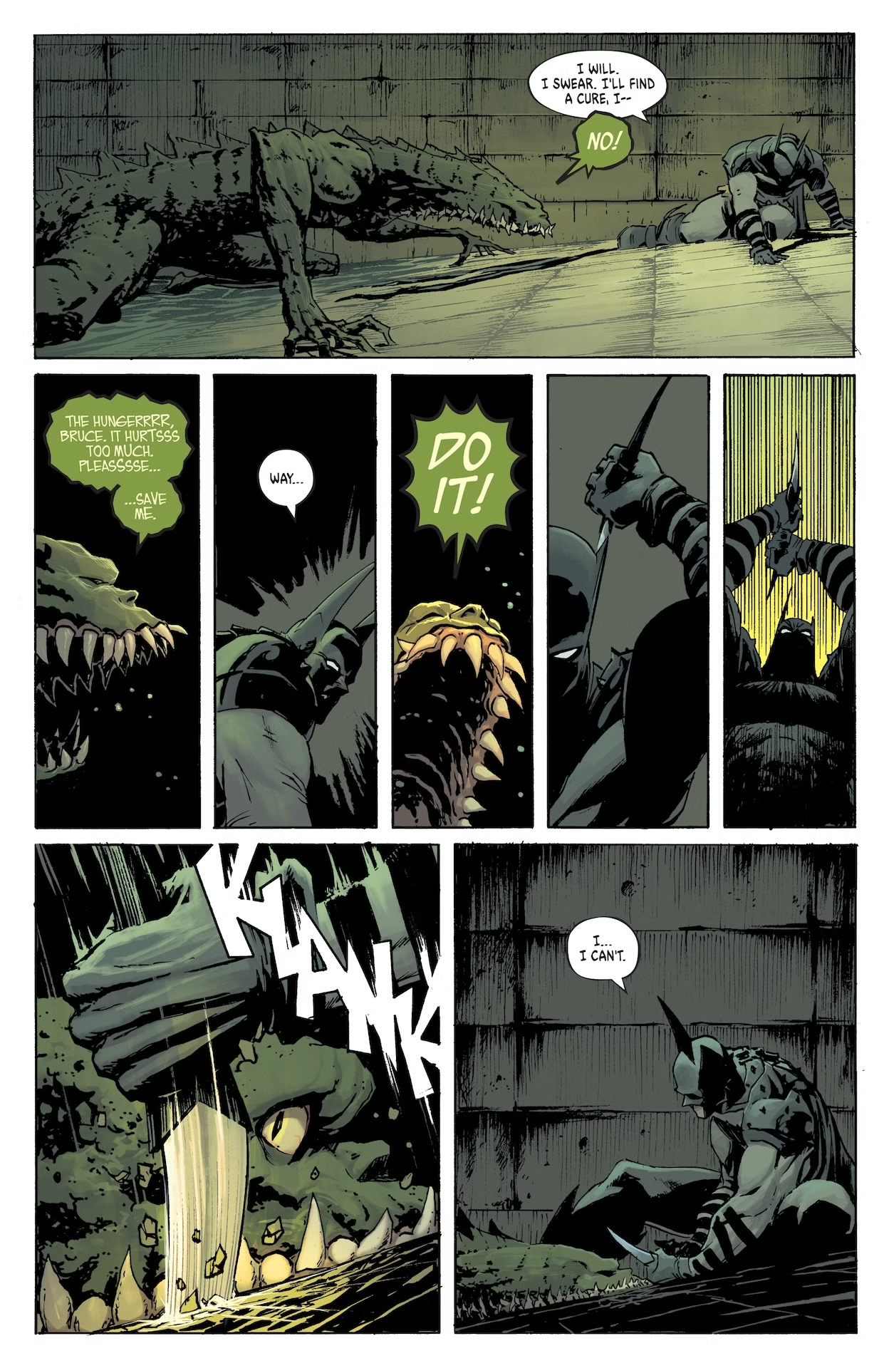 На представленных страницах Бэтмен пытается урезонить мутировавшего Уэйлона Джонса, более известного нам всем в качестве Убийцы Крока. Джонс пытается сдерживаться и просит своего друга убить его, но Тёмный рыцарь отказывается. Под карающую длань Бейна попали и остальные друзья Брюса Уэйна. Это Харви Дент, Освальд Кобблпот и Эдвард Нигма. Это Двуликий, Пингвин и Загадочник. Наверняка после пережитого они будут обвинять Бэтмена в своих бедах, а там уже и в злодейство перейдут. Кстати, наш ушастый протагонист сам страдает от присутствия Яда в своём организме.