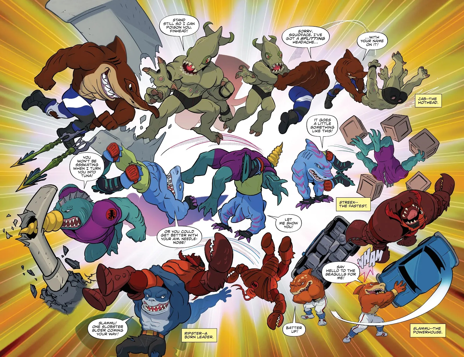 Надо сказать, что Street Sharks #1 от сценаристки Стефани Уильямс (Nubia and the Amazons) и художника Ариэля Меделя (TMNT vs. Street Fighter) прямо кусает читателя ностальгией как своими обложками, так и показанными страницами.