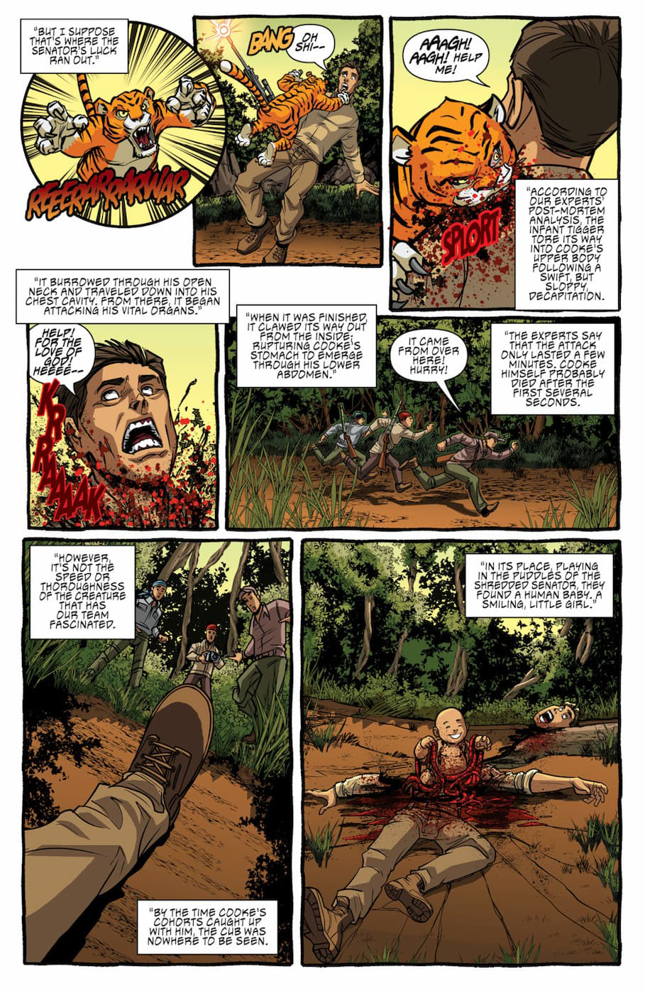 Тут заходят сразу с места в кровавую кашу. На показанной странице маленький тигрик нападает на какого-то мужика в джунглях и буквально рвёт его на части. Кровь, кишки во все стороны, а посреди всего этого безумия внезапно оказывается младенец. Ничего не понятно, но интригует.