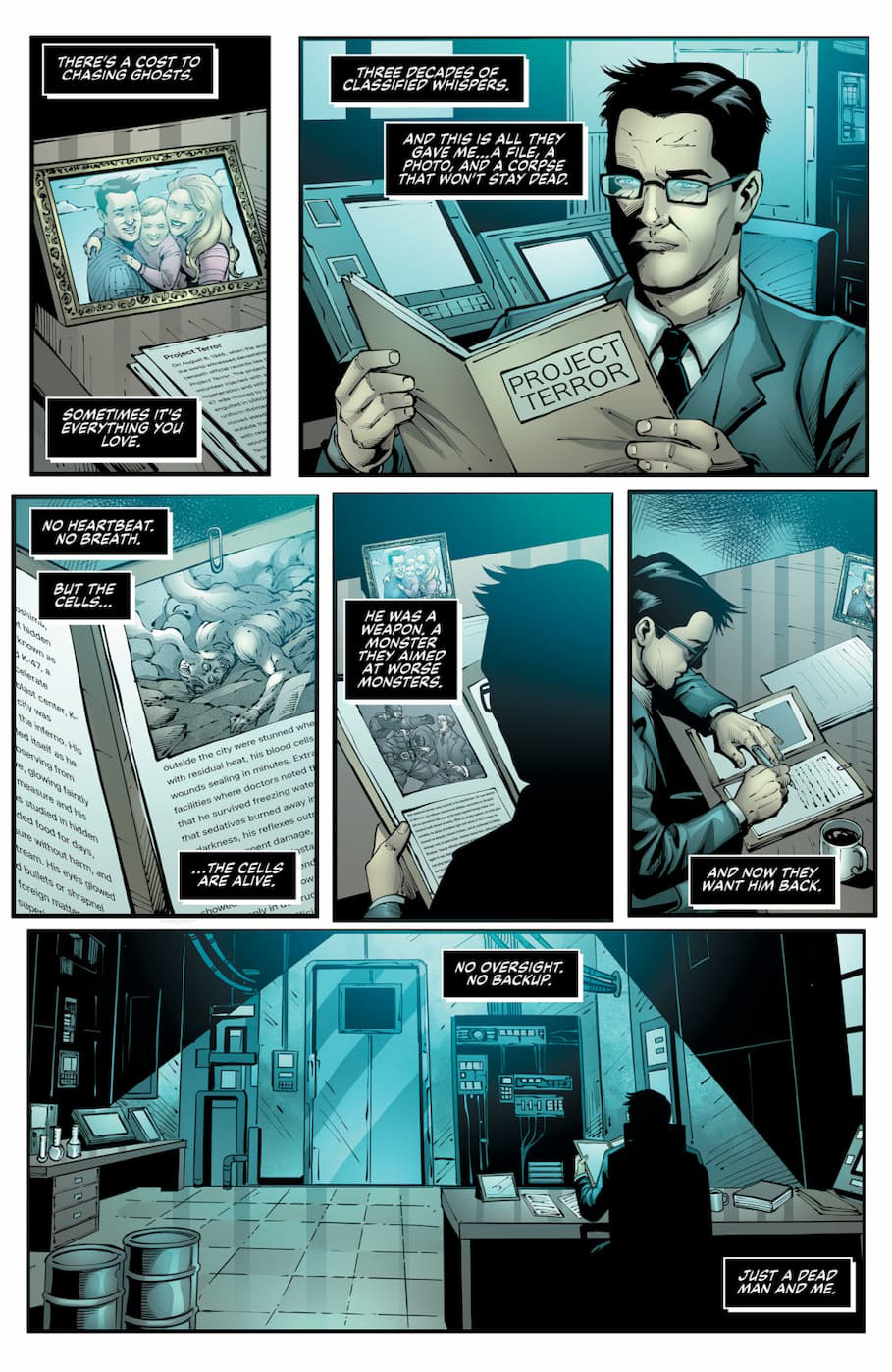 Напоследок — Terror: Resurrection («Террор: Воскрешение»). Здесь снова поработал Бруши, а рисовал Джулиус Абрера (Van Helsing: Sword of Heaven). Обложка со здоровенным мужиком, заляпанным кровищей, явно относится к этой истории. Меж тем на странице всё мирно, и какой-то дядя читает папку с надписью «Проект Террор». Похоже, что на следующей странице всё пойдёт вразнос.