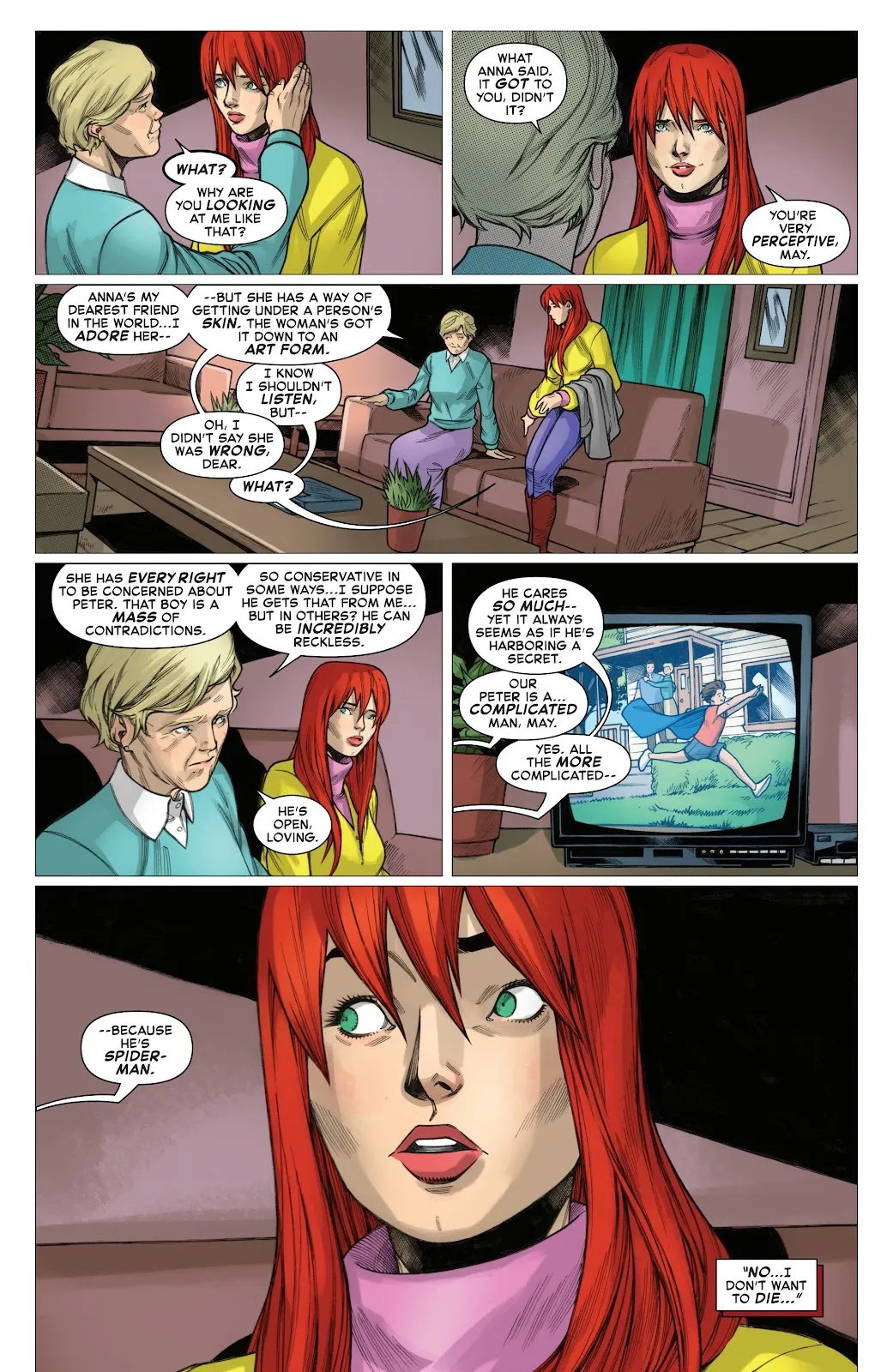 Но куда интереснее побочная сюжетная линия выпуска с Мэри Джейн. Во время разговора с тётей Мэй обе женщины обсуждают Питера. И в конце «сцены» Мэй даёт знать рыжей то, что она знает главный секрет её племянника. ДеМаттейс решил подглядеть этот твист из игры Marvel's Spider-Man от Insomniac Games? А, ну ещё там в номере свежеклонированый Каин пытается понять кто он.