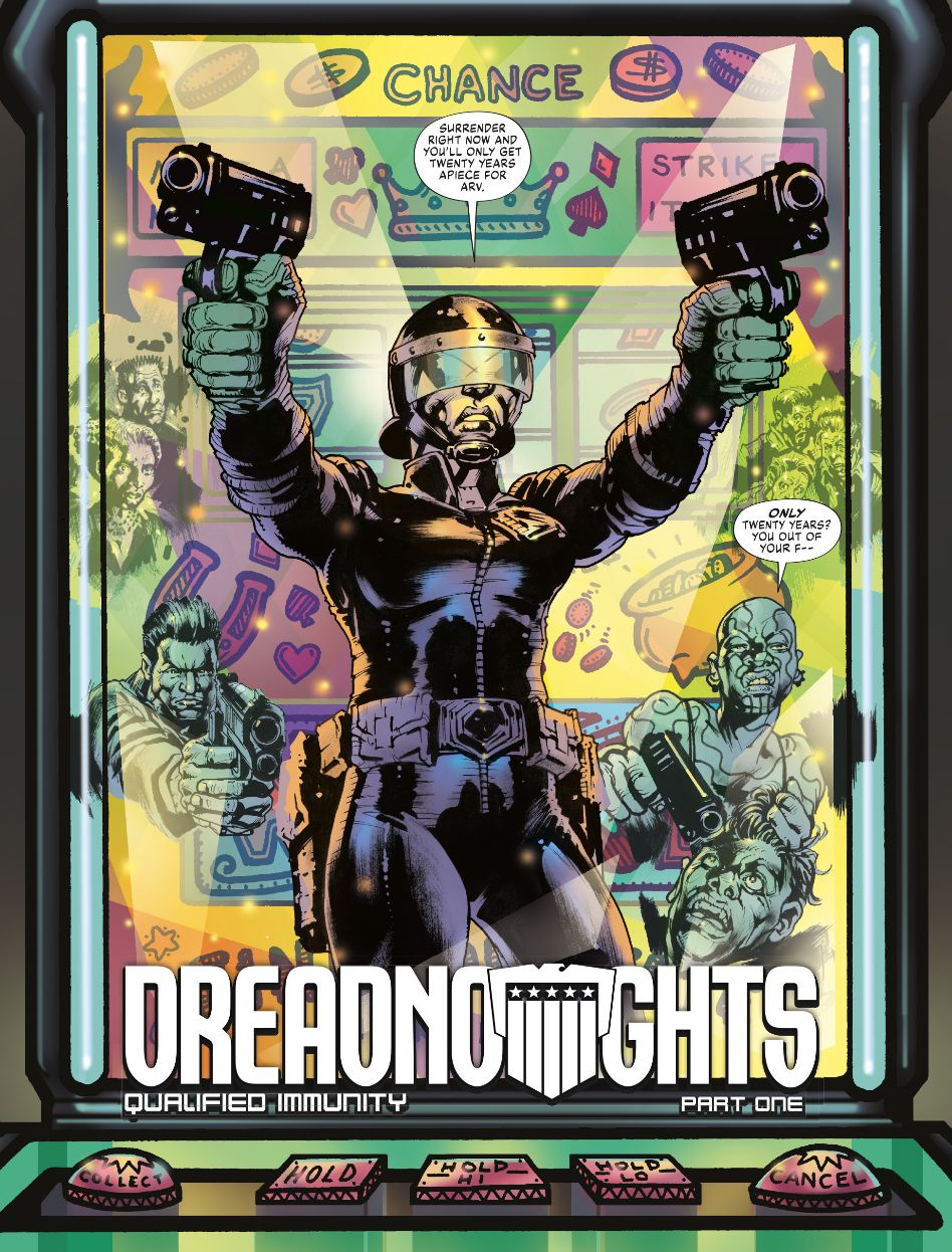 Для любителей жёсткого политического реализма фанатам вернут Dreadnoughts — серию, что получила признание критиков за исследование того, как люди пришли к созданию системы Судей, причём именно до периода службы Дредда. Копались в этом Майк Кэрролл, Джон Хиггинс и Салли Хёрст.