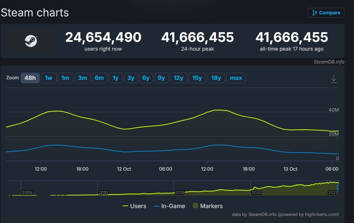 Вышедший на прошлой неделе милитари-шутер Battlefield 6 уже неплохо себя показал — поставил рекорд по одновременному онлайну среди всех игр издательства EA в Steam. Мы писали об этом здесь. Однако это отнюдь не единственное достижение виртуальной войны — благодаря шутеру, пиковый онлайн игроков в Steam тоже преодолел собственный максимум. На данный момент рекордное значение пользователей онлайн за всё время существования Steam равно 41 666 455 игроков.