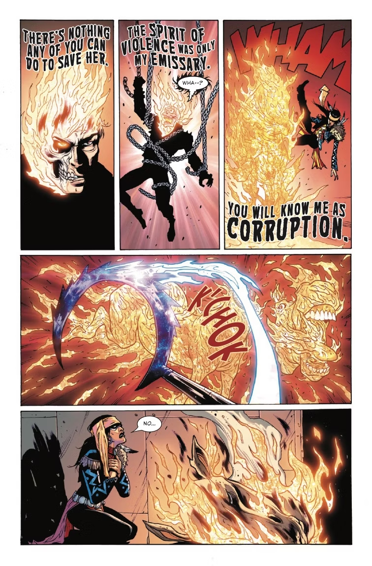 На представленных страницах видно, что Блейз узнаёт о том, что его уже покойную жену Роксанну пытает не кто-либо, а сам «создатель Духа Насилия». Он убеждён, что Джонни не сможет спасти свою любимую, а ещё представился под именем Разложение (Развращение, Порча, Гниение – вариантов для перевода хватает).
