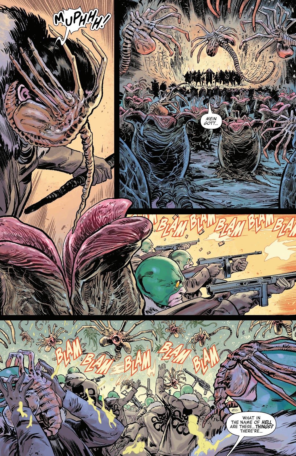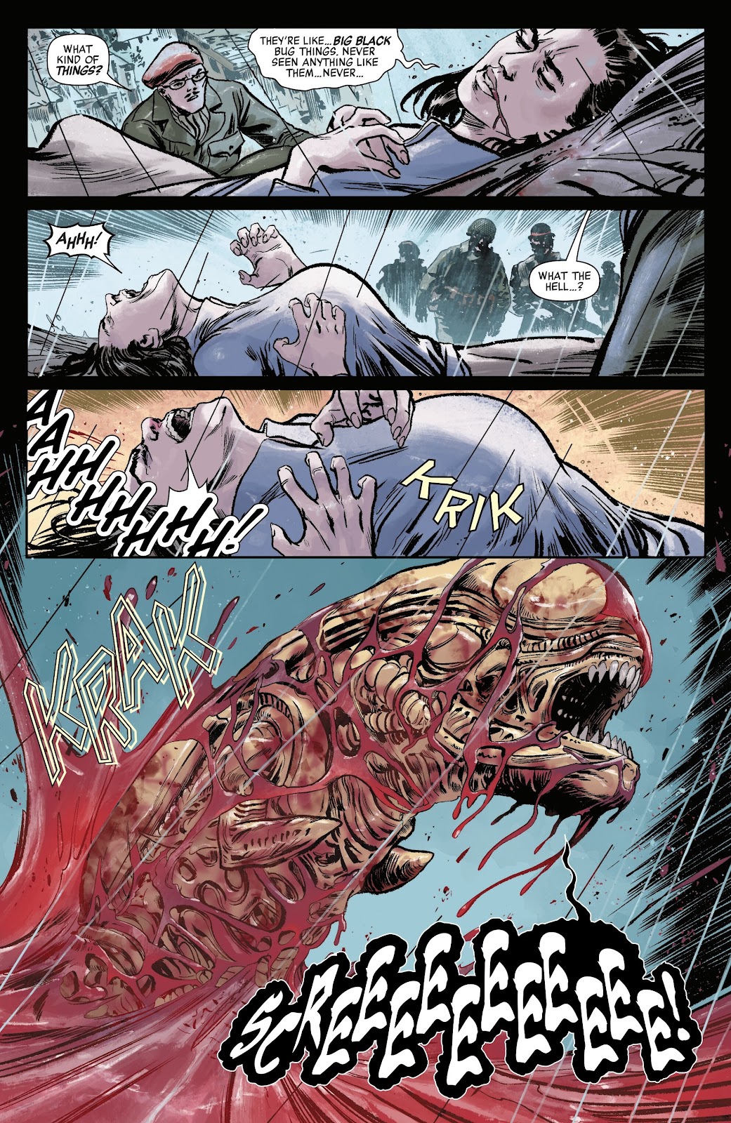 Как видим, Кэп привычно бьётся с гидровцами и даже не подозревает, что скоро ему придётся столкнуться с ксеноморфами. Надо сказать, что комикс пытается отрабатывать свой якобы «взрослый» рейтинг — нам даже показали, как грудолом вылезает из женщины. Ну и куда же без атаки полчищ лицехватов.