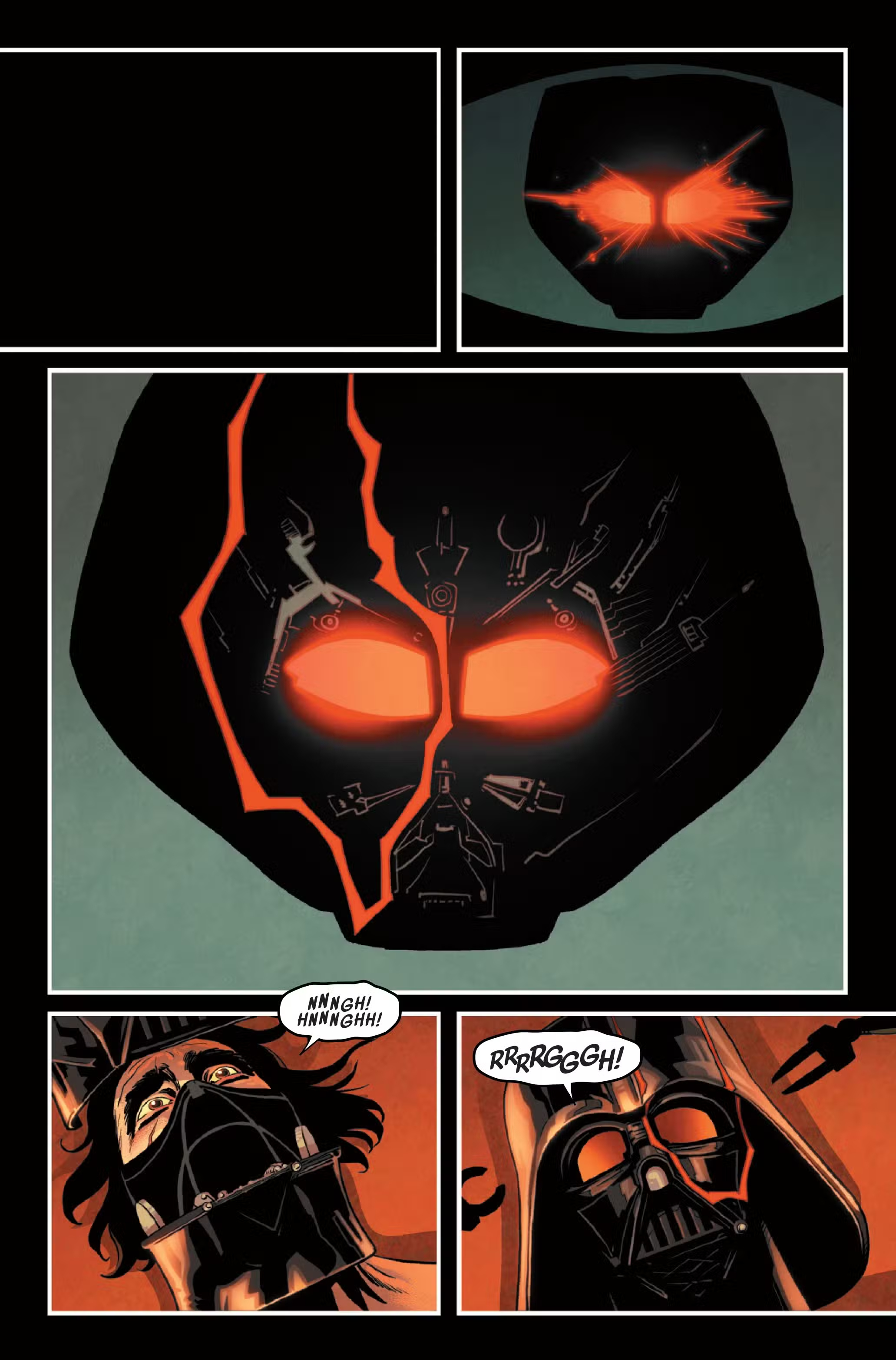 Кайло как-то не очень согласен с такой постановкой вопроса. На последней из показанных страниц шлем деда начинает его попросту терзать, превратившись в намордник, который его душит. Такая вот прямолинейная метафора.