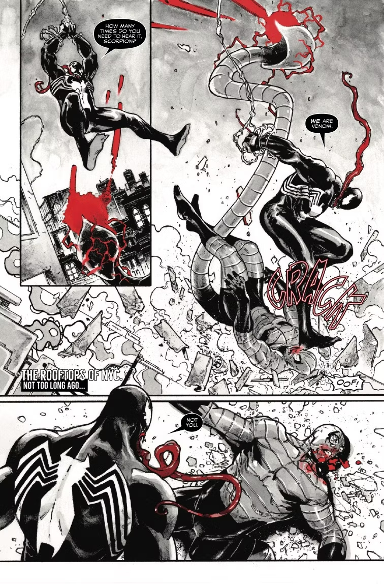 Рич Дуэк (Magic) и Роберт Гилл (X-Force) подробно показали попытку злодея Скорпиона украсть симбиота у Эдди Брока — с ужасными последствиями. Видимо, он решил ещё раз побыть в чёрном живом костюме. Да, Мак Гарган тоже какое-то время был вторым (третьим, технически) персонажем, что носил его.