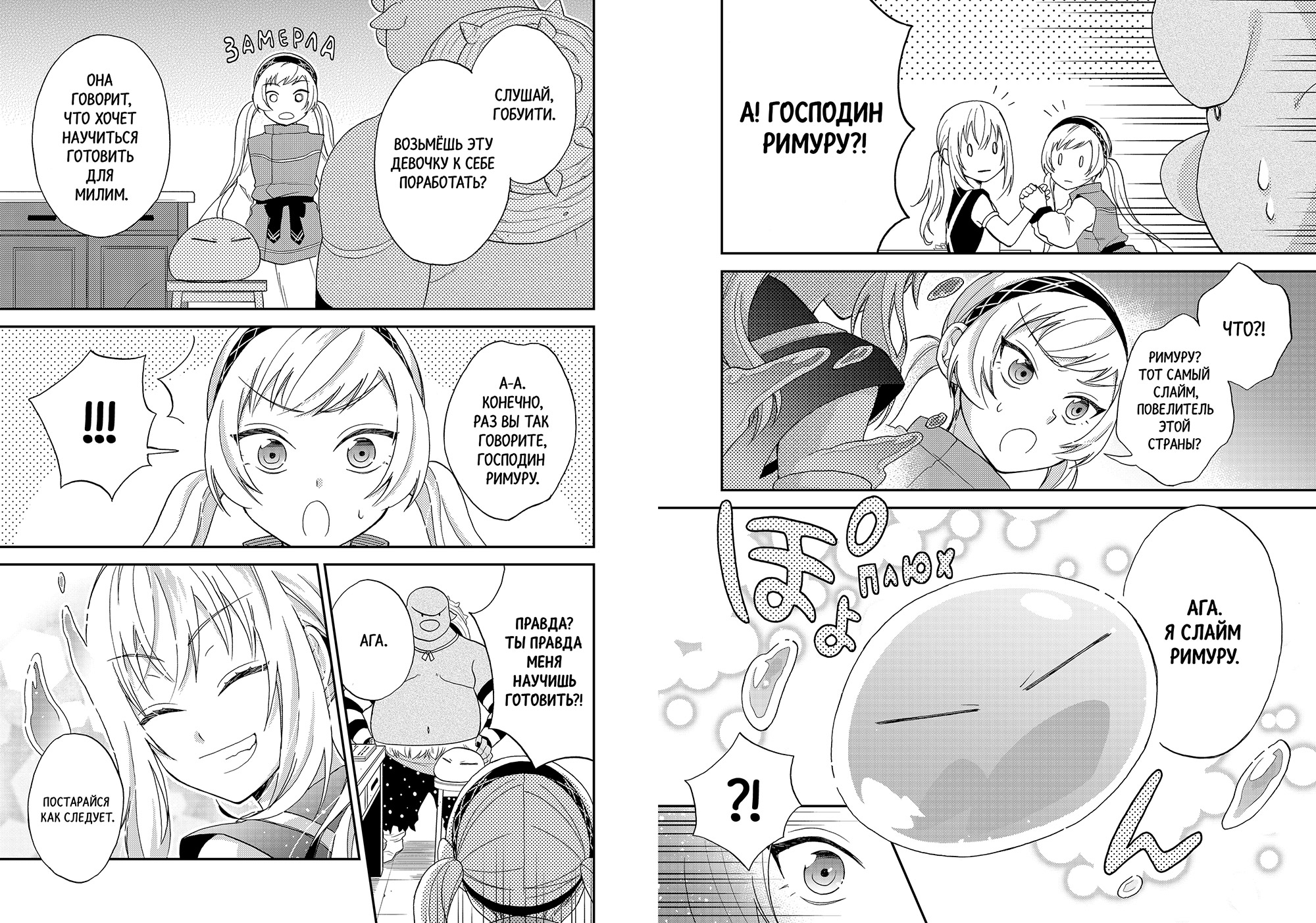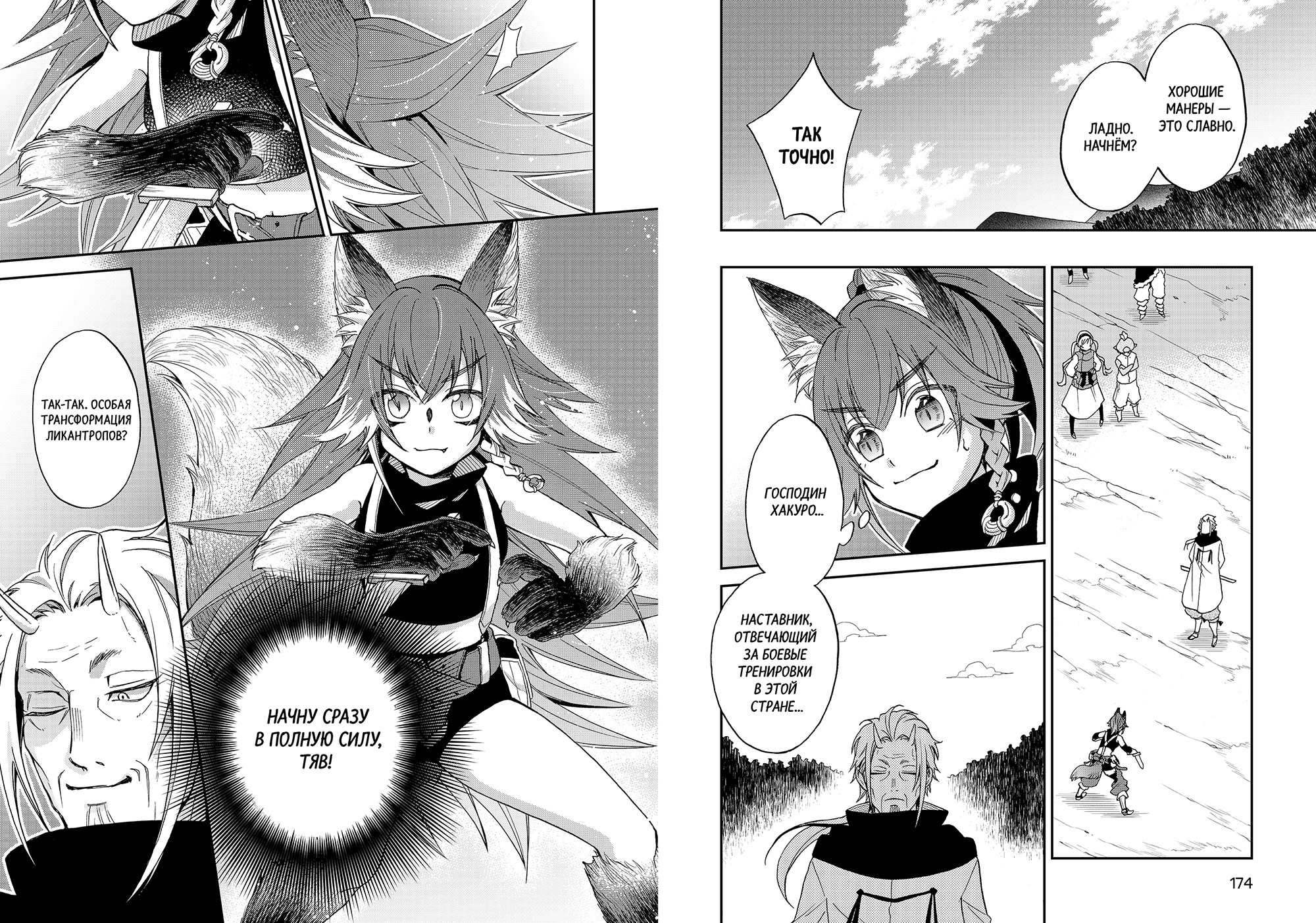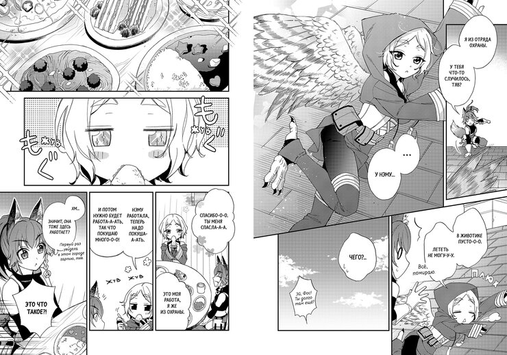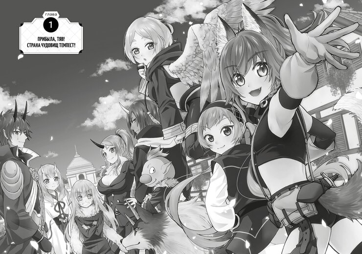 Впрочем, с последним мы забегаем вперёд: обещанием подобного первая книга заканчивается, в то время как основное её содержание — штука куда более мирная, приземлённая и напоминающая настроем уже неоднократно помянутые «Дневники». Настроем — но не интересностью, потому что следить за тем, как с мирной жизнью в Темпесте знакомятся три новых персонажа, наделённых своими целями и уникальными придурями, оказывается куда интереснее, чем просто любоваться этой мирной жизнью. Ещё и зашли авторы правильно — с харизматичнейшей из трёх героинь. Чутка придурошная и энергичная лисичка Фос мигом заряжает своим позитивным настроем читателя и настраивает на нужный лад. Уже потом к ней присоединяется слегка придурошная и самоуверенная почитательница Милим по имени Стелла, а также слегка придурошная и вечно сонная гарпия Нэму. Все они прибыли из потенциально дружеских Темпесту государств, чтобы разобраться, можно ли стране чудовищ доверять, да так и осели тут, увлёкшись саморазвитием и изучением культурных особенностей. Ничего невероятного, казалось бы, но работает ровно потому же, почему работает оригинал: приятные персонажи делают забавные вещи и постепенно двигаются к успеху (пусть и не такими семимильными шагами, как любимый публикой блоб-попаданец.