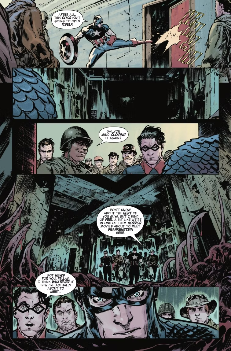Капитан Америка ведёт Баки Барнса и остальных членов «Ревущих коммандос» за линию фронта, чтобы освободить одного из своих… но никто не готов к тому ужасу, который они обнаруживают в самой секретной базе «Гидры»!
