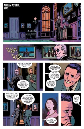 На показанных страницах нам демонстрируют 1945 год. А именно день, когда доктор Амадеус Аркхем решил, наконец, продать основанную им психиатрическую лечебницу. Как оказалось, истоки того, что позже станет «Аркхемом М» Джокера, были не чем иным, попыткой сделать что-то правильное. Но, как мы все знаем, благими намерениями выложена дорога в Ад. А в этом случае — в лабораторию для жутких экспериментов.
