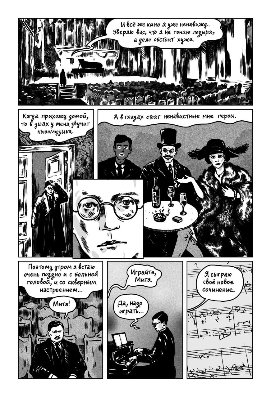 «Шостакович. Сумбур и музыка» предположительно выйдет где-то в сентябре этого года, аккурат ко дню рождения композитора. Количество страниц пока неизвестно. Но, думается нам, без лака на обложке не обойдётся, плюс наверняка будет галерея вариантов каверов, как было в прошлых комиксах серии.