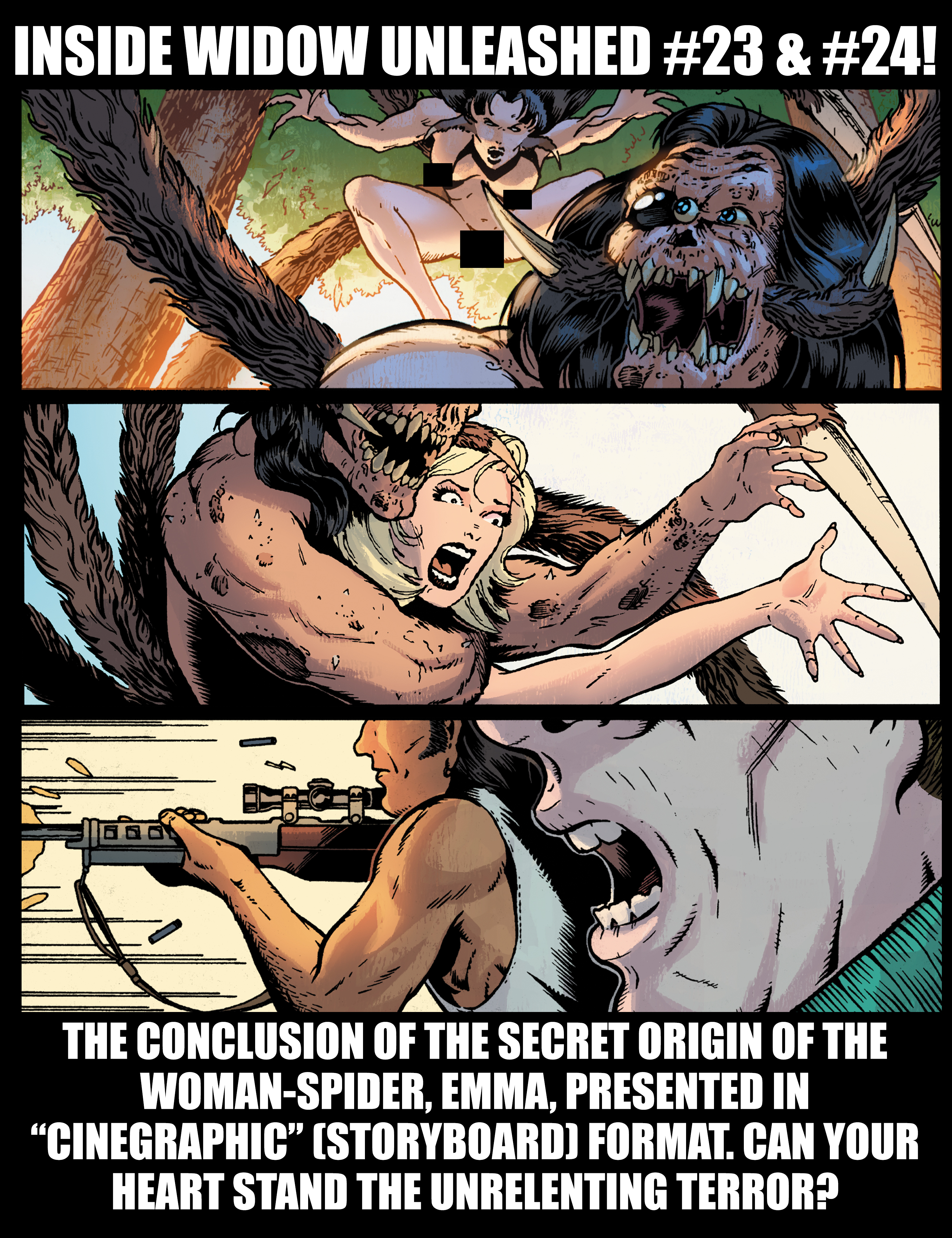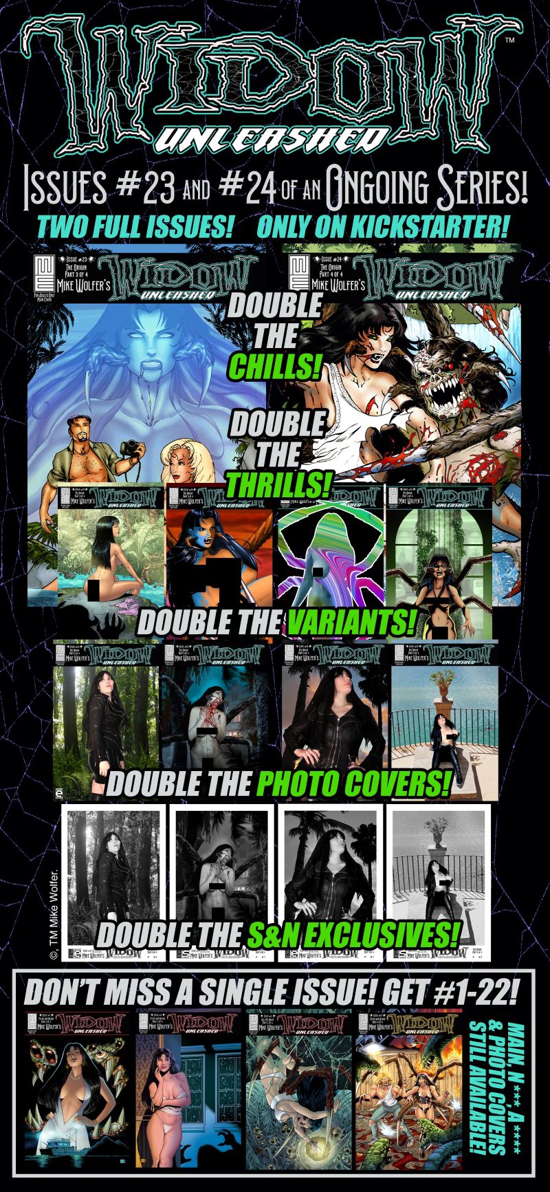 Комикс потихоньку выходил, но вот с финальными двумя выпусками под названием Widow Unleashed решил выйти на краудфандинг-сервис Kickstarter, где запросил полторы тысячи долларов. Уже собрали семь — фанаты любят этот трешак.