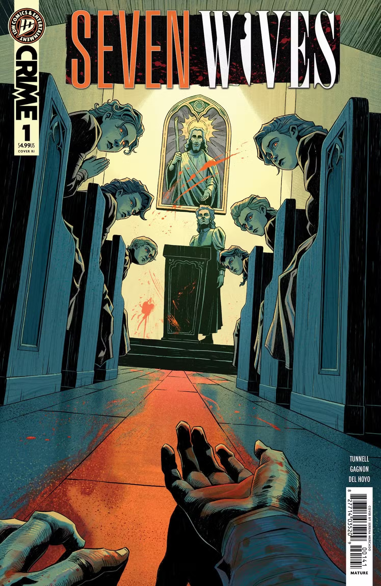 Похоже, вся речь была ради любимой жены. Первой ласточкой в мае станет Seven Wives («Семь жён»). Это мини-серии из трёх выпусков от сценаристки Зои Таннелл(Godzilla: Valentine's Day Special) и художниц В. Ганьон и Тесслин Бергин-Дикои. В ней расскажут о мужчине, живущем в комплексе «Фундаменталистской церкви Иисуса Христа Святых последних дней» в Аризоне. Его убили при множестве свидетелей. Это ладно, главное, что у него имеется семь жён, каждая из которых может быть убийцей или знать его. Семь потенциальных подозреваемых — это, конечно, не десять негритят как у Агаты Кристи, но всё равно неплохо.