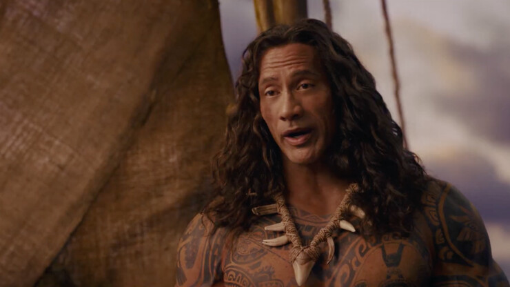 Студия Disney выкатила полноценный трейлер художественной картины по мотивам одноимённого анимационного фильма собственного изготовления «Моана». Если в первом тизере персонажа Дуэйна Джонсона принципиально не показывали, тот в этом видео полубог Мауи во всей красе: