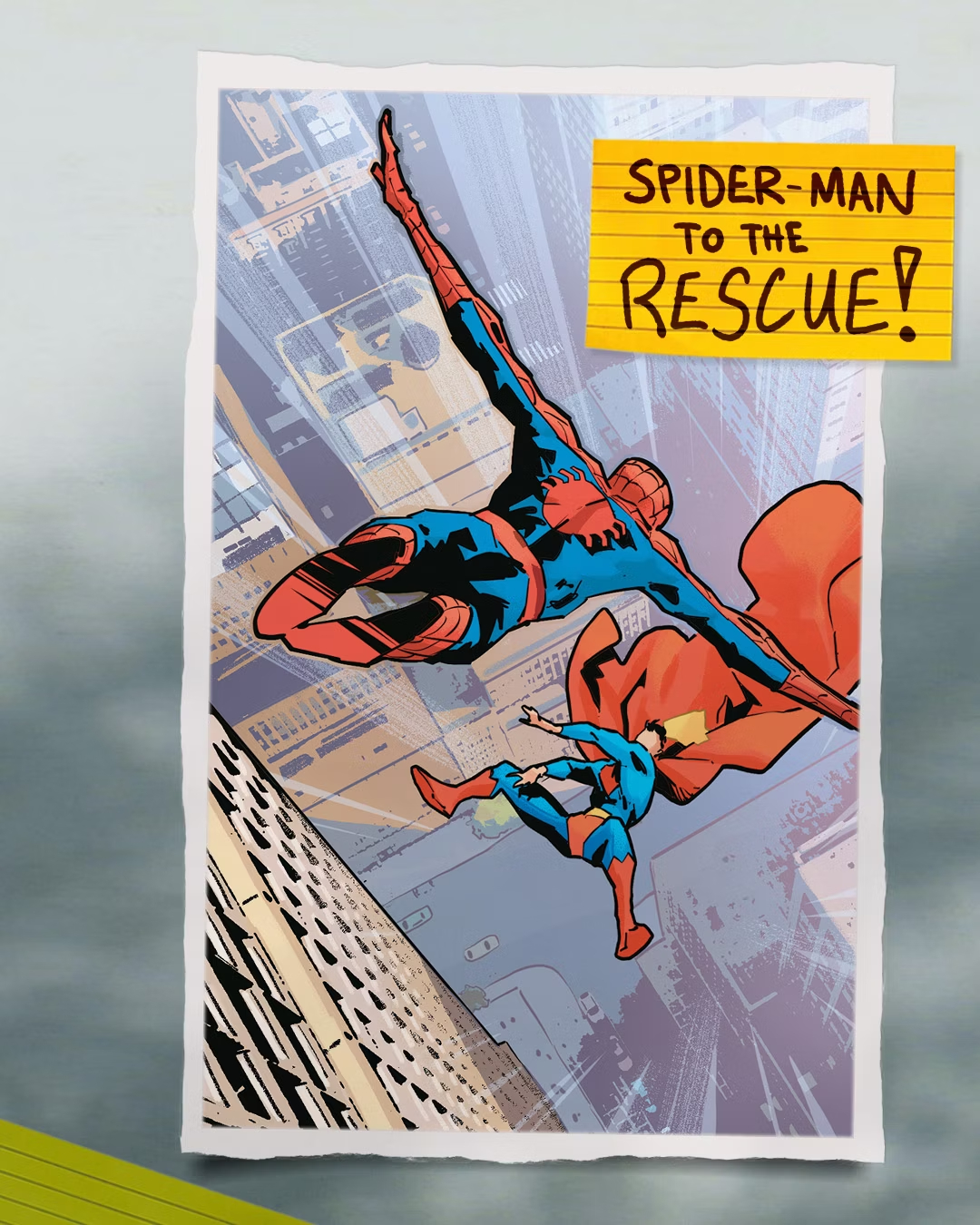 DC Comics выложила серию псевдофотографий Человека-Паука и Супермена. Судя по всему, Человек из стали попадает под излучение криптонита и оказывается совершенно беспомощным — причём в самый неподходящий момент, когда ему нужно взлететь. И вот так бы расшибся он в красно-синюю лепёшку, если бы не стенолаз. В этот раз он не использовал паутину, чтобы не повторилась ситуация с трагически погибшей Гвен Стейси.