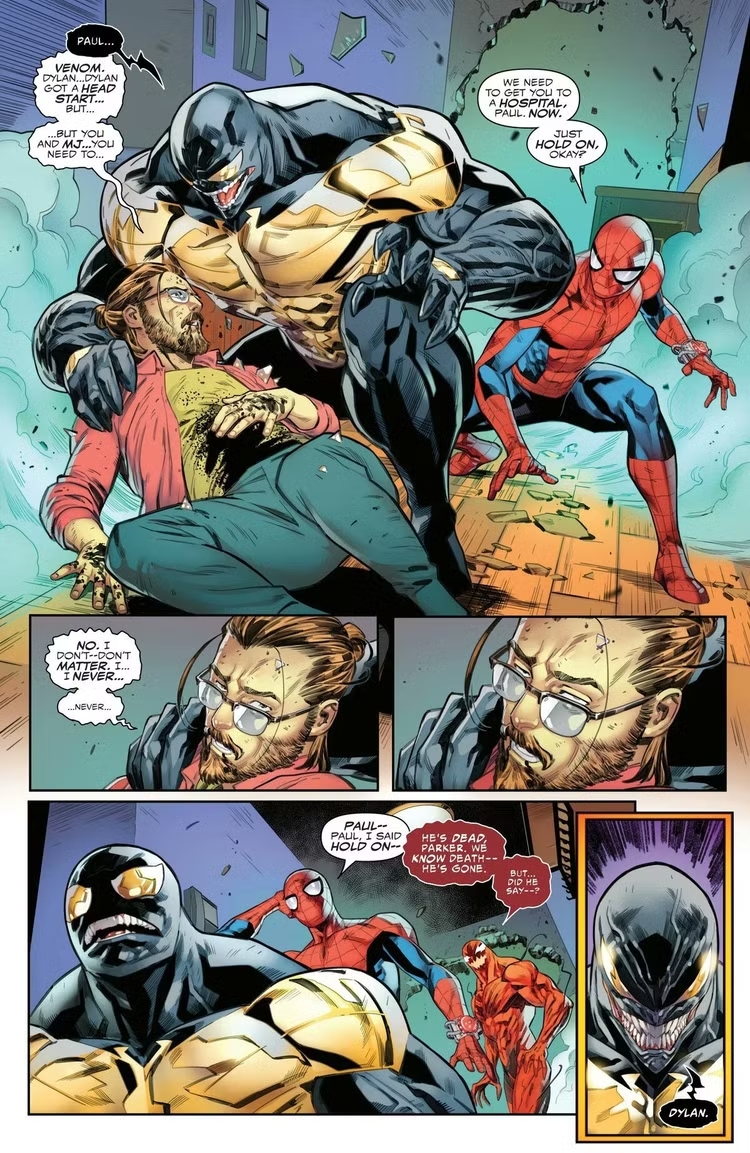 Человек-паук и Эм-Джей в облике Венома становятся свидетелями гибели Пола. Фактически он помирает на её руках. А потом ещё и Карнаж сообщает, что он окончательно погиб. Само собой, в комиксах никто не умирает. Только вот в чём штука: издательству нет никого смысла возвращать его обратно. Толку от него особо не было, а сейчас, когда Мэри стала Веномом и подавно. Забавно, что его укокошили даже не в основной серии про Паука. Всё это происходит в рамках очередной большой сюжетной арки «Смертельная спираль», связанной с симбиотами. Как мы видим, Marvel исправляет всю ту фигню, что успел наворотить Уэллс.