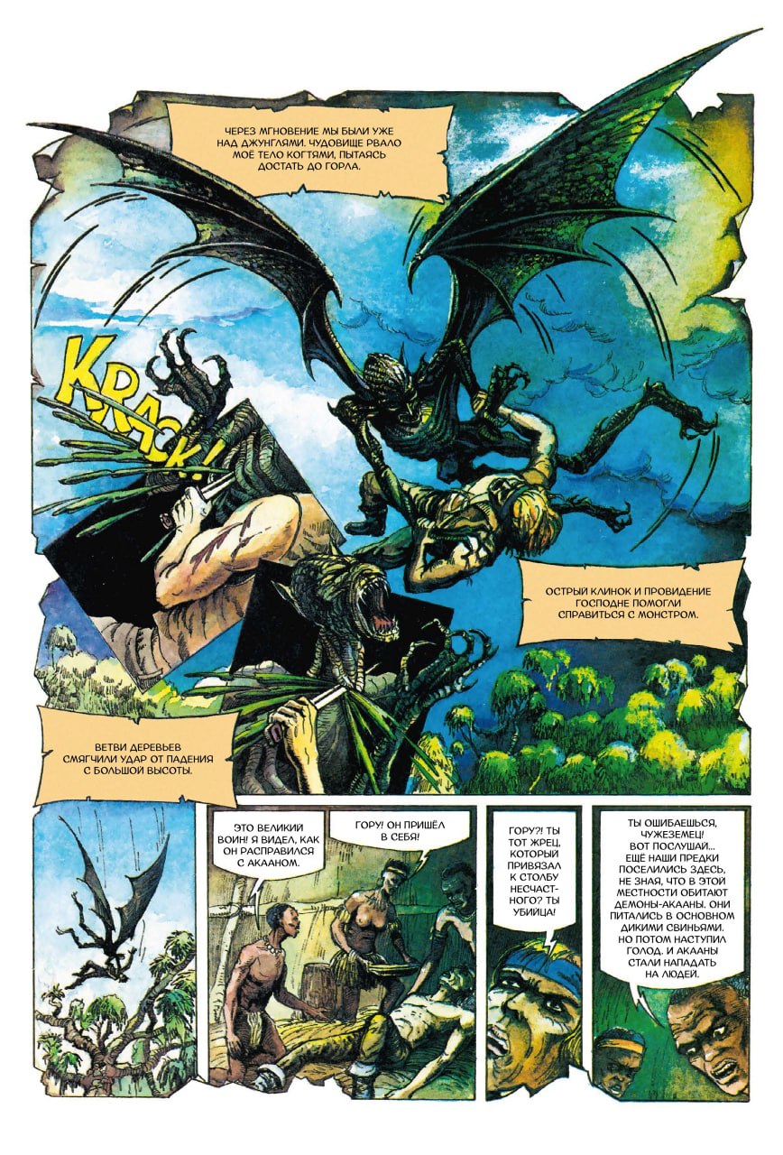 В этот раз именно такой случай. В 1992 году вышел белорусский комикс «Посланцы» за авторством Виктора Чайчука. Частично он основан на рассказе Роберта Ирвина Говарда «Крылья в ночи». Да, того самого писателя, подарившего нам великого Конана-варвара. Конкретно эта история была из цикла о Соломоне Кейне. Тираж был всего 200 тыс. копий и теперь его переиздадут.