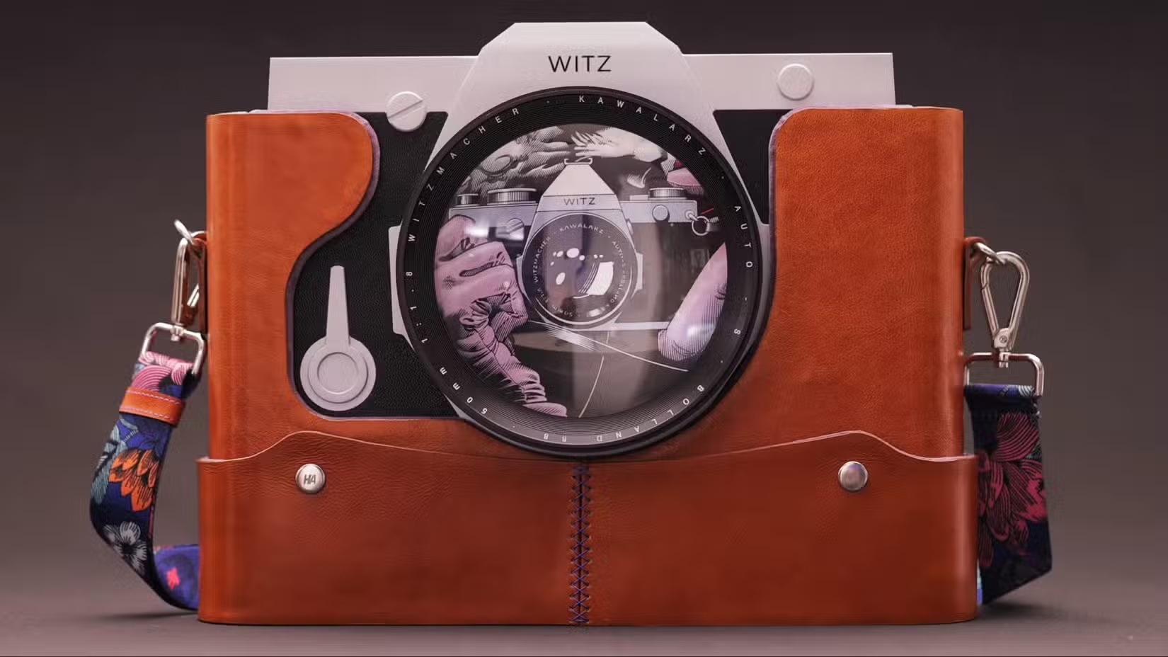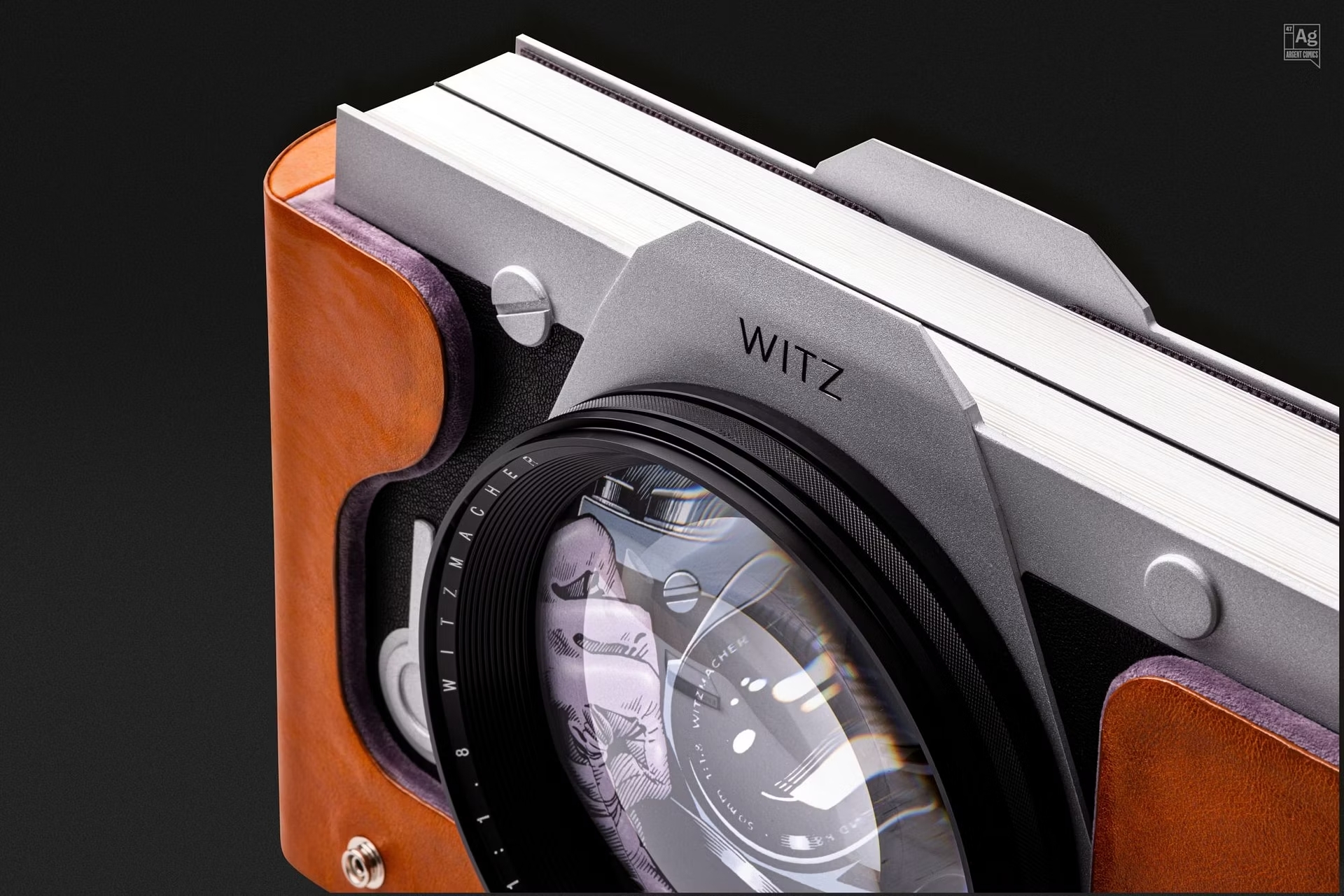 Основная фишка, которая сразу бросается в глаза — специальная упаковка. Переплетённая вручную книга не просто напоминает камеру, которую Джокер держит на оригинальной обложке. Её сделали так, чтобы она ощущалась как настоящий винтажный фотоаппарат: корпус из тонко фрезерованного алюминия с отделкой из стеклянных бусин, чёрная кожаная обтяжка для захвата и съёмный анодированный алюминиевый объектив, который держится на магнитах.