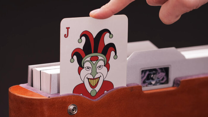 Это ещё не всё. В корпусе имеется отсек, из которого выскакивает реплика культовой игральной карты злодея. А для читателей, предпочитающих мобильность, к футляру прилагается ремень для переноски. Он почти точь-в-точь совпадает по расцветке с гавайской рубашкой, в которой злодей являлся в квартиру Барбары Гордон. В общем, максимально набрасывают всяких штучек для истинных коллекционеров.
