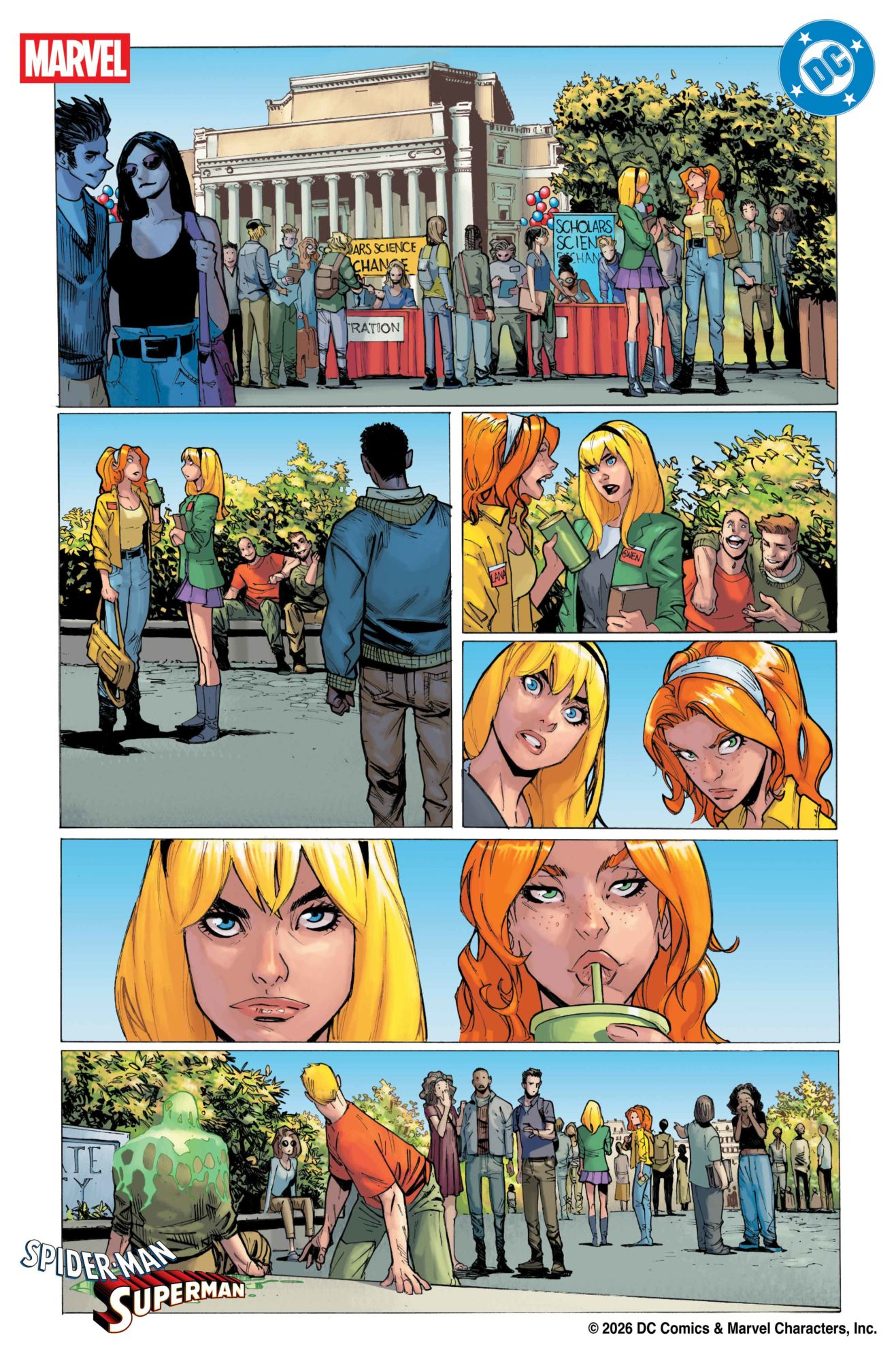 Нынешний сценарист The Amazing Spider-Man Джо Келли и художник Умберто Рамос (тоже часто рисовал «паучьи» комиксы) представили встречу Гвен Стейси и Ланы Лэнг в университетском кампусе. Напомним, что девушки — первые возлюбленные стенолаза и криптонца;